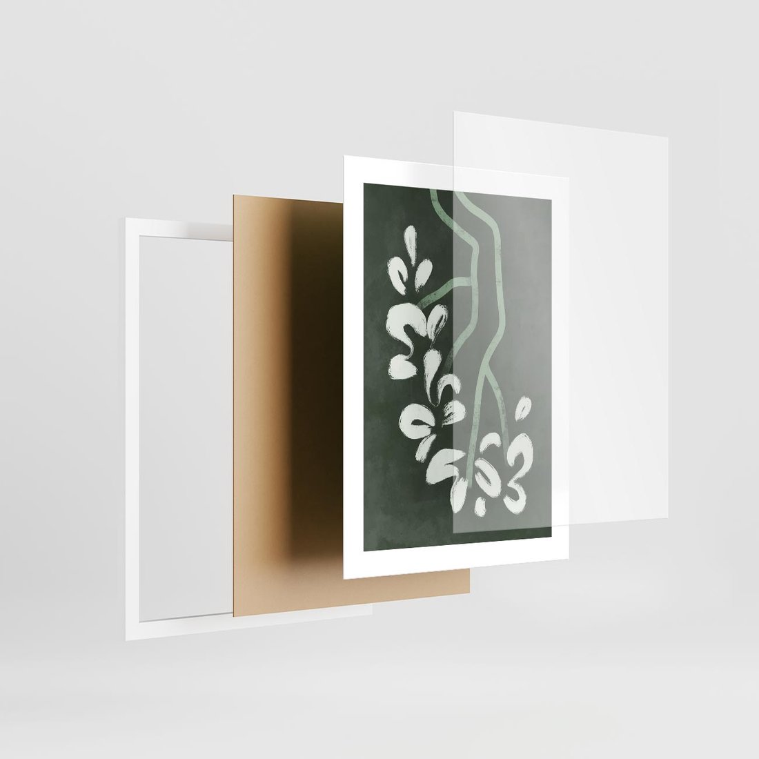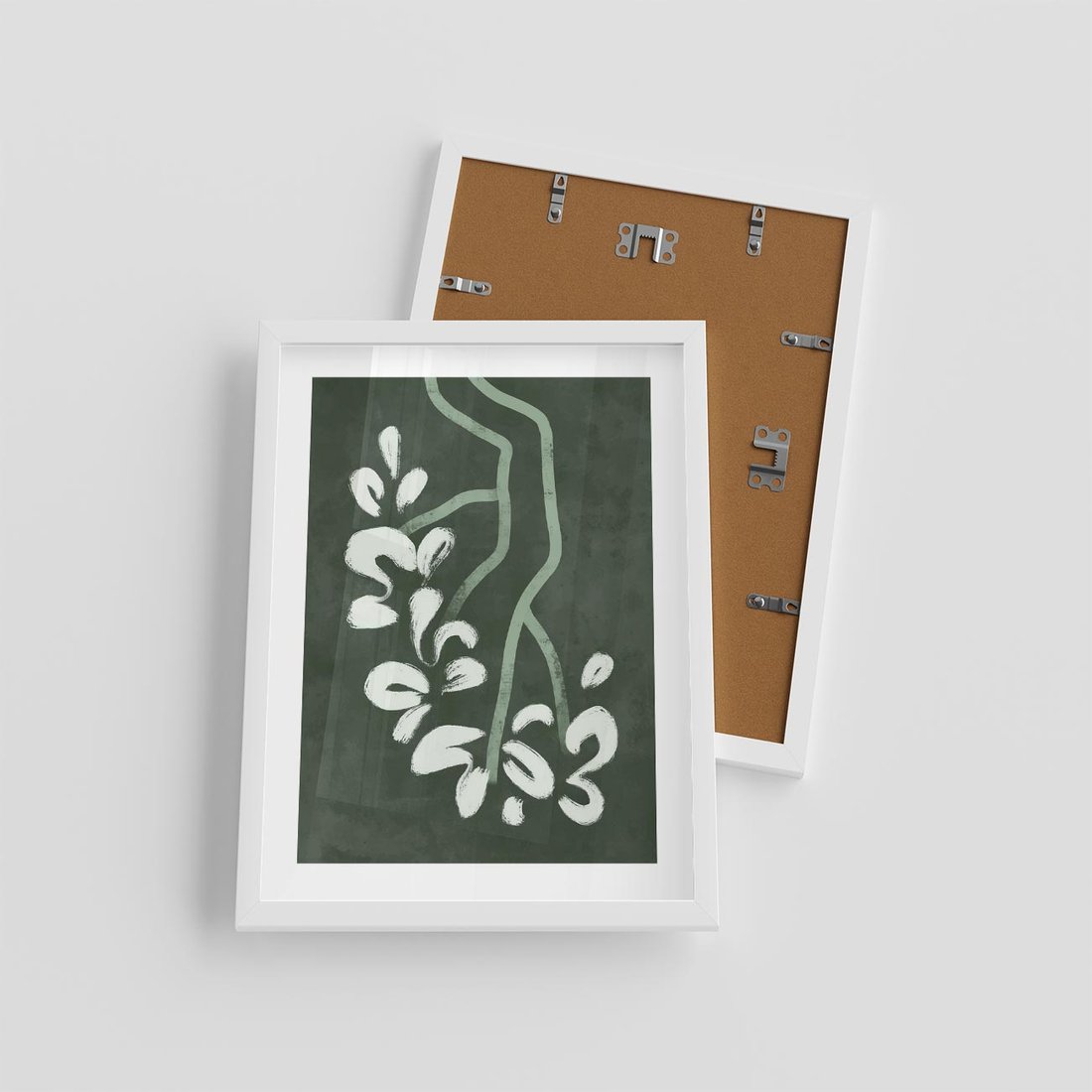 Ten nowoczesny plakat ukazuje abstrakcyjne, delikatne zielone linie przypominające gałęzie kwiatów. To wyjątkowe połączenie natury i nowoczesnej estetyki wprowadza do Twojej przestrzeni subtelność i oryginalność, tworząc jednocześnie interesujący akcent artystyczny.