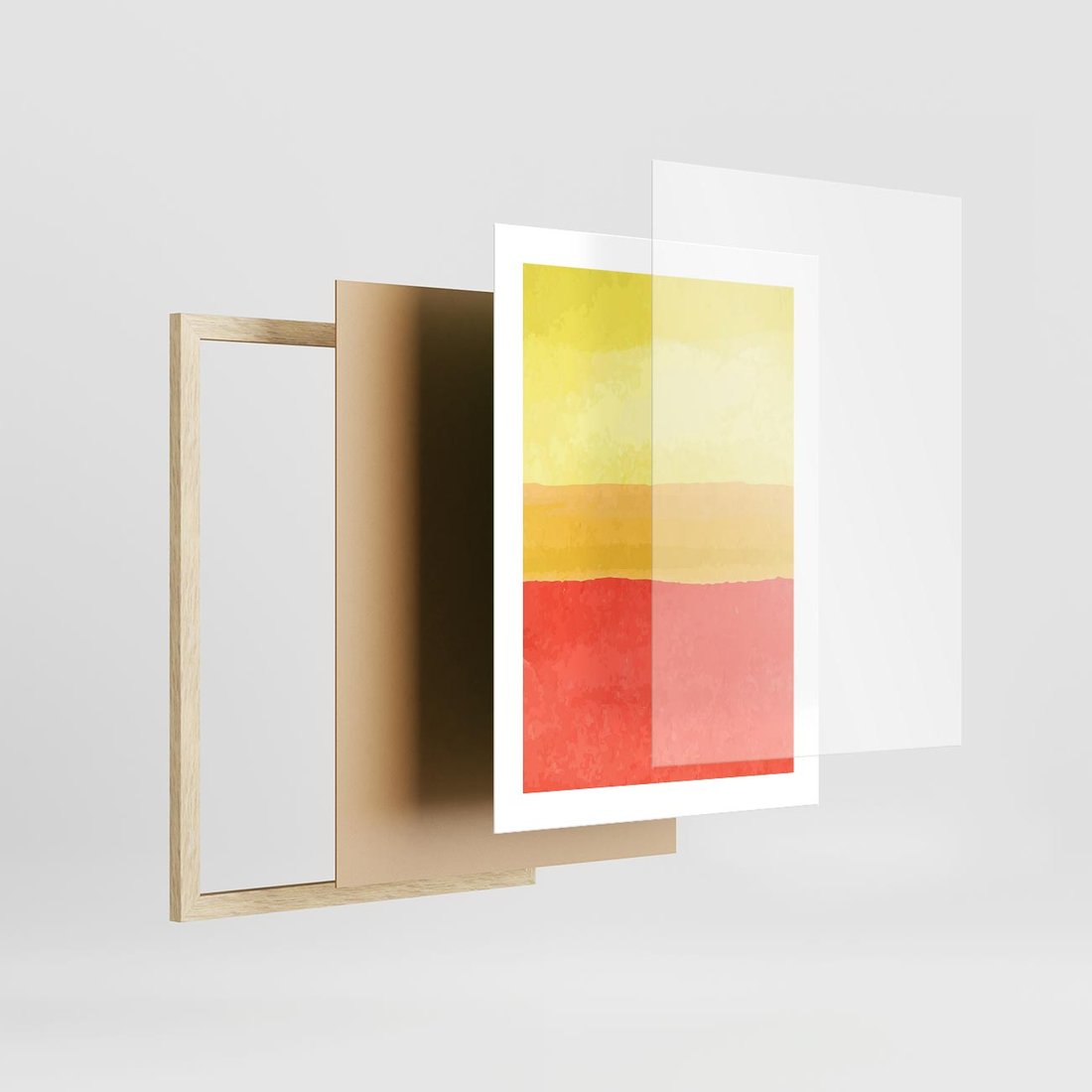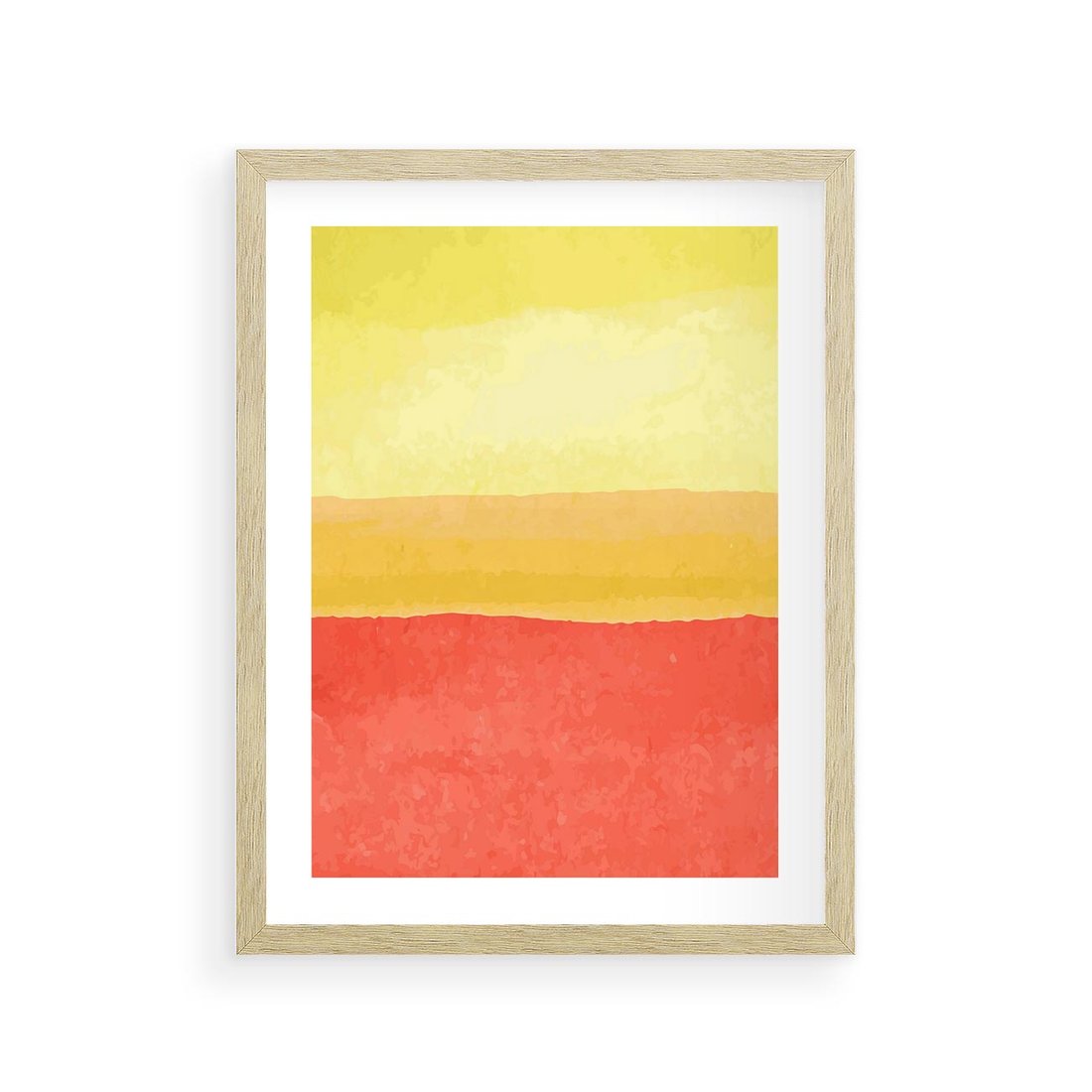 Plakat w ramie 30x40 - Rozmyte Odbicia - kolorowe akwarelowe pasy, odcienie żółci i czerwieni - rama drewno