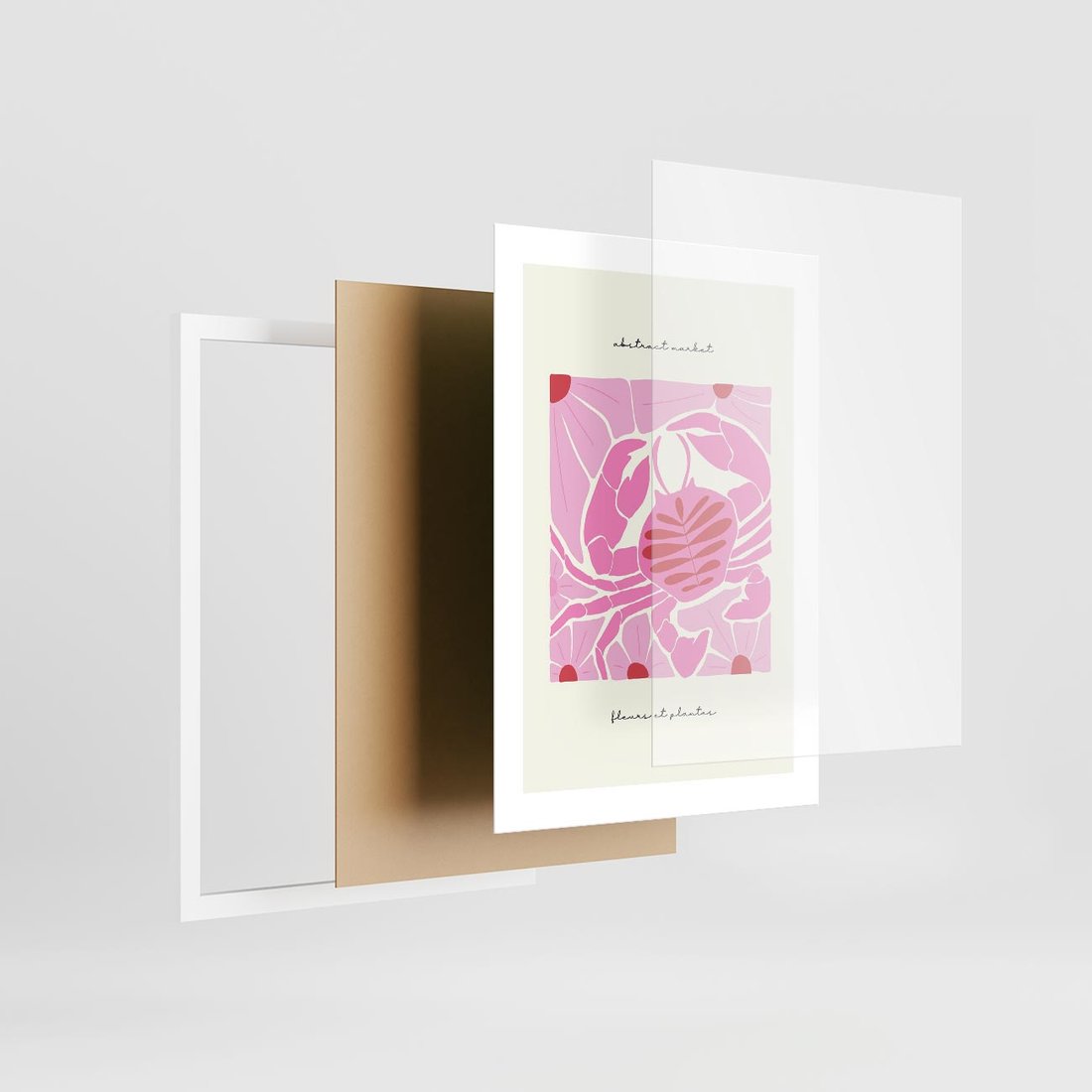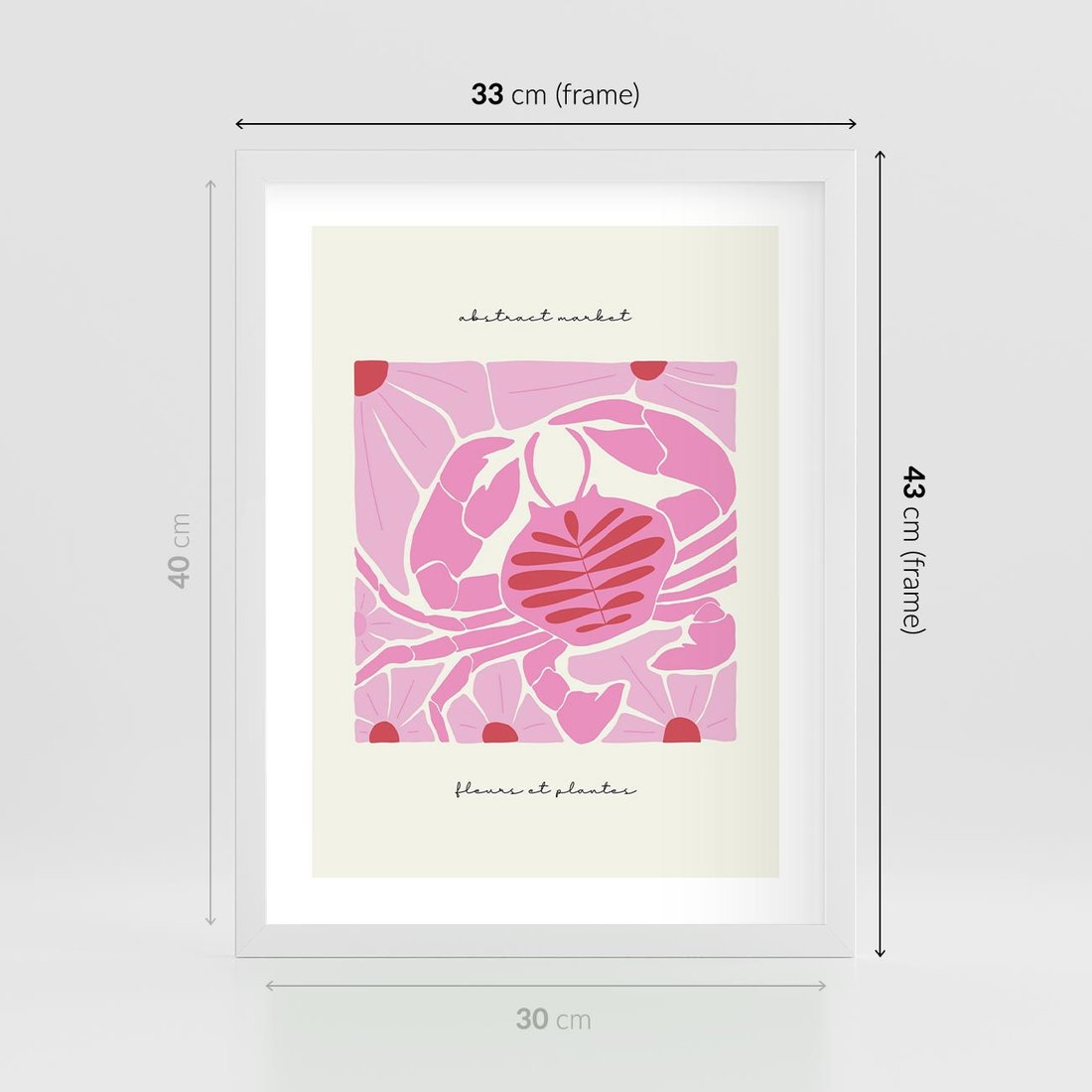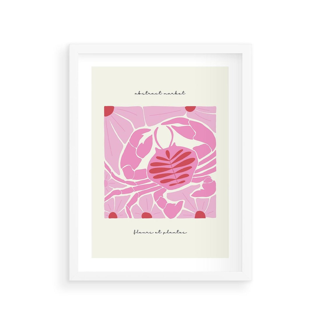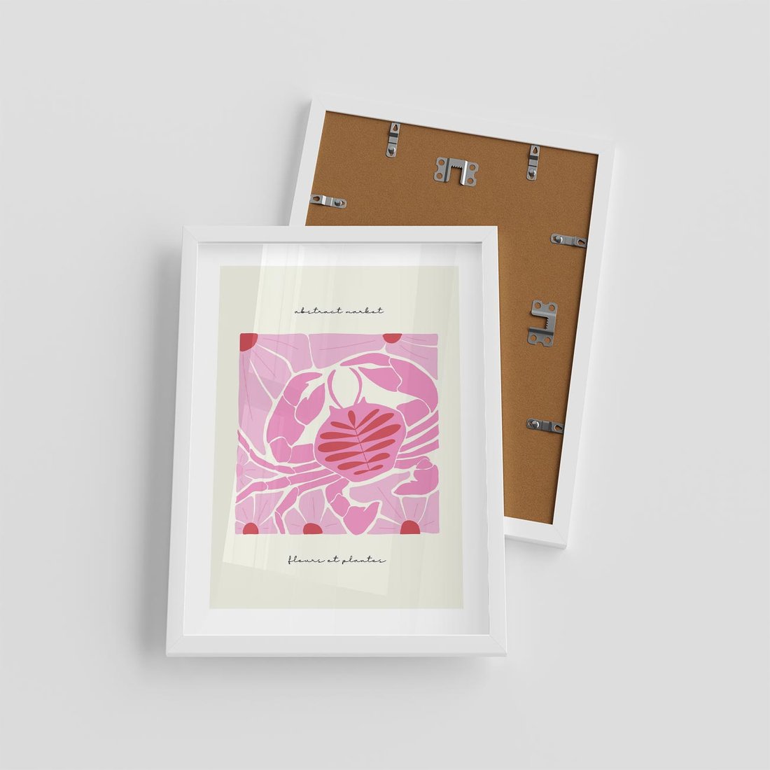 Ten abstrakcyjny plakat przedstawia kraba w nowoczesny sposób, używając delikatnych odcieni różu. Sztuka ta nadaje nową perspektywę naturze, tworząc kompozycję pełną wyobraźni i harmonii.