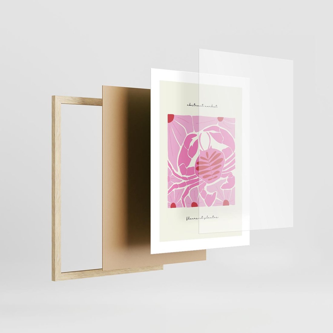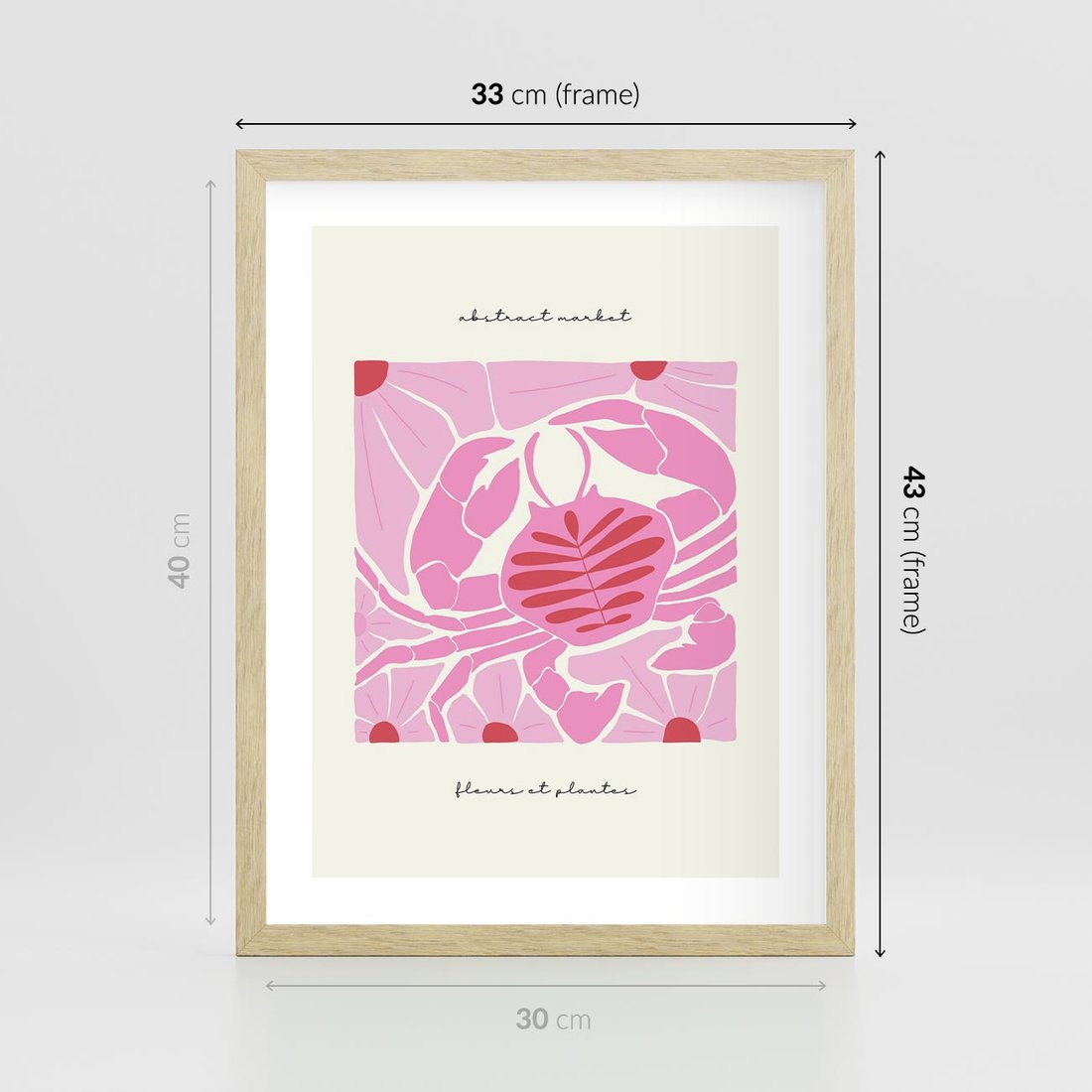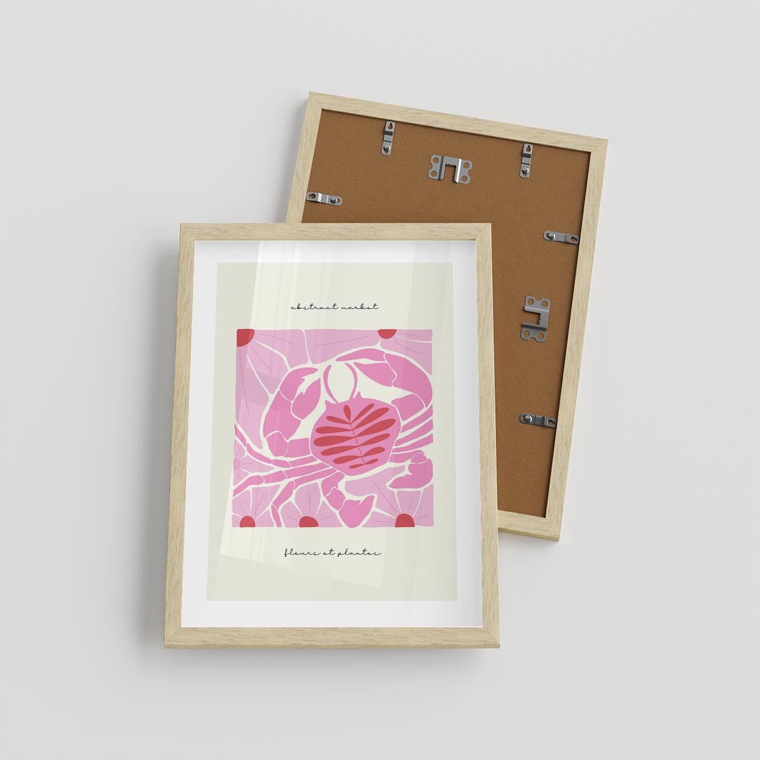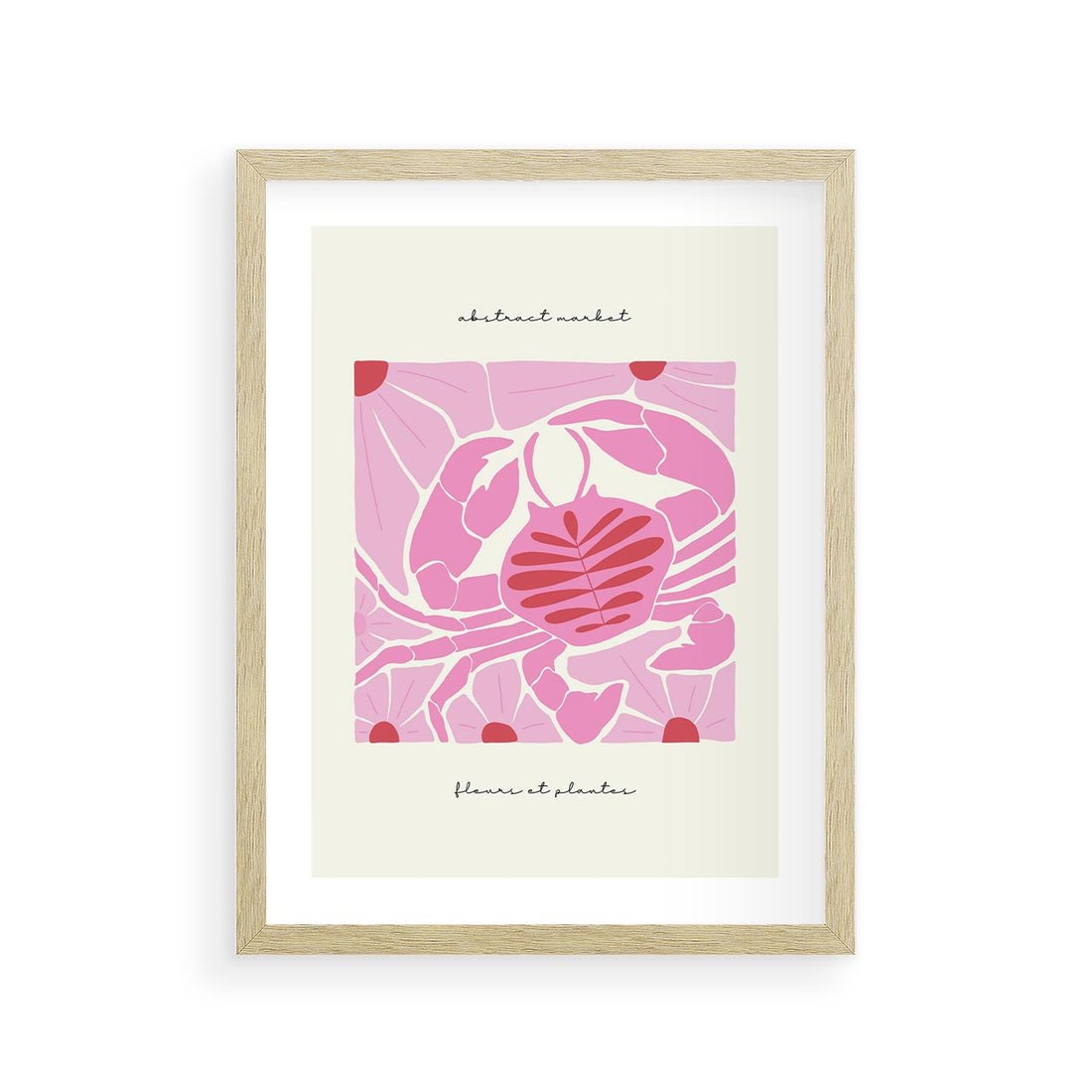 Ten abstrakcyjny plakat przedstawia kraba w nowoczesny sposób, używając delikatnych odcieni różu. Sztuka ta nadaje nową perspektywę naturze, tworząc kompozycję pełną wyobraźni i harmonii.