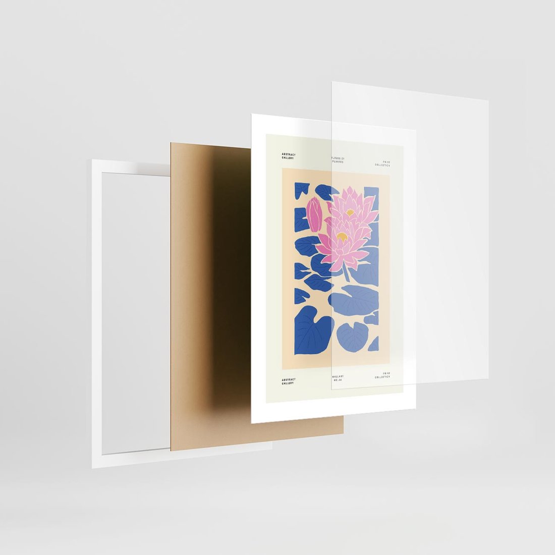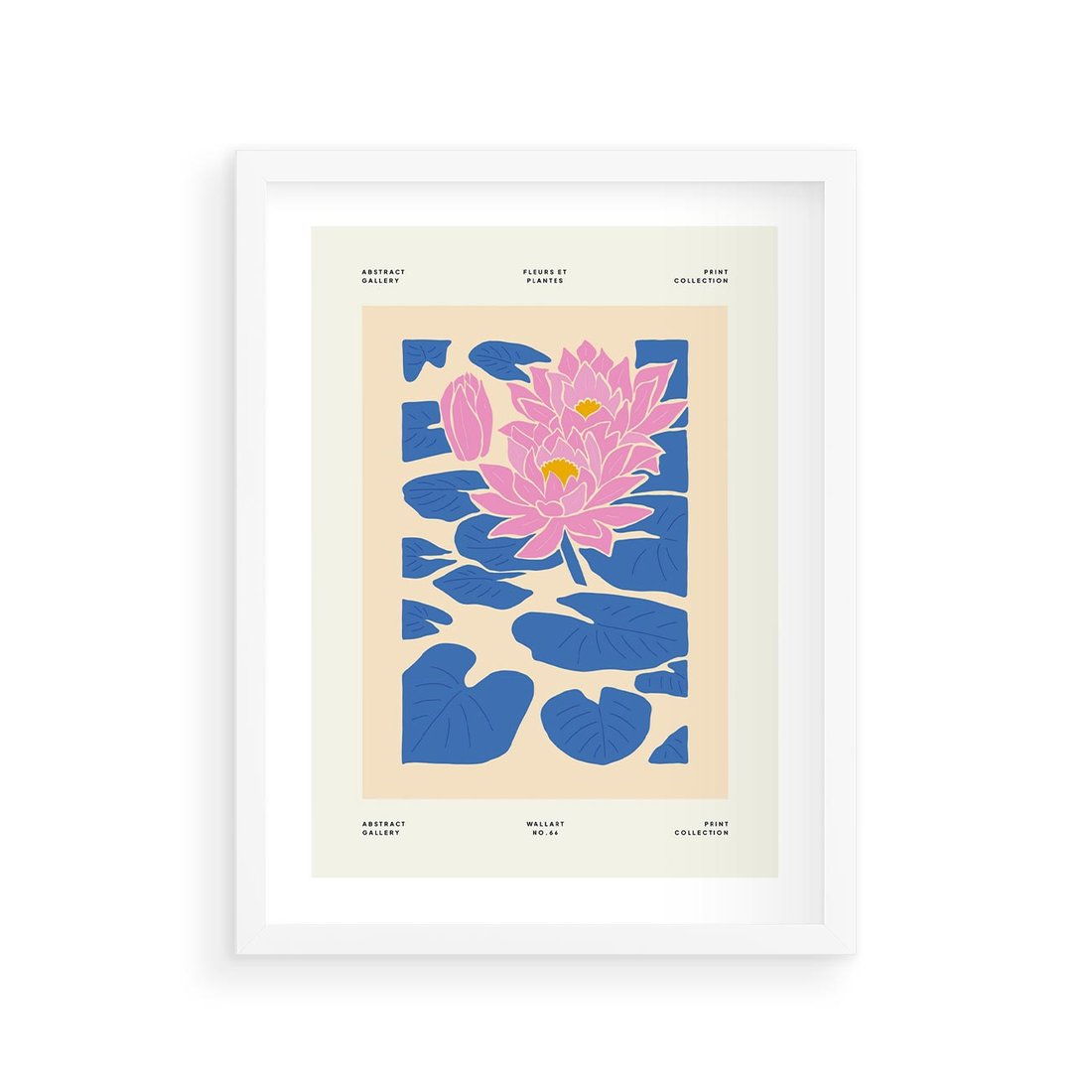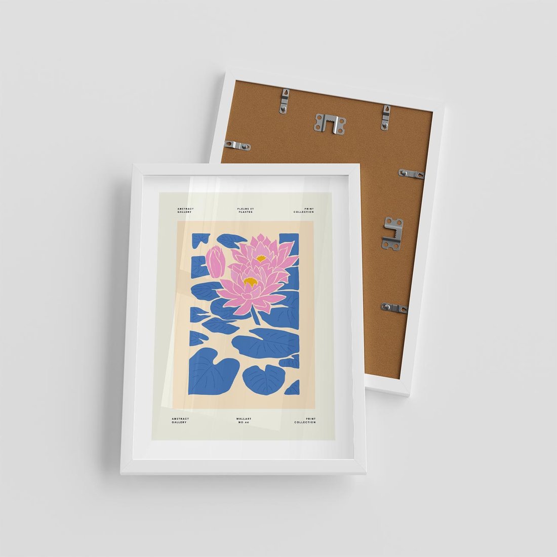 Ten nowoczesny plakat ukazuje pastelowe lilie wodne w odcieniach błękitu i różu, tworząc spokojny i oniryczny obraz. Sztuka ta jest idealnym dodatkiem do sypialni, tworząc atmosferę sennej harmonii i piękna natury.