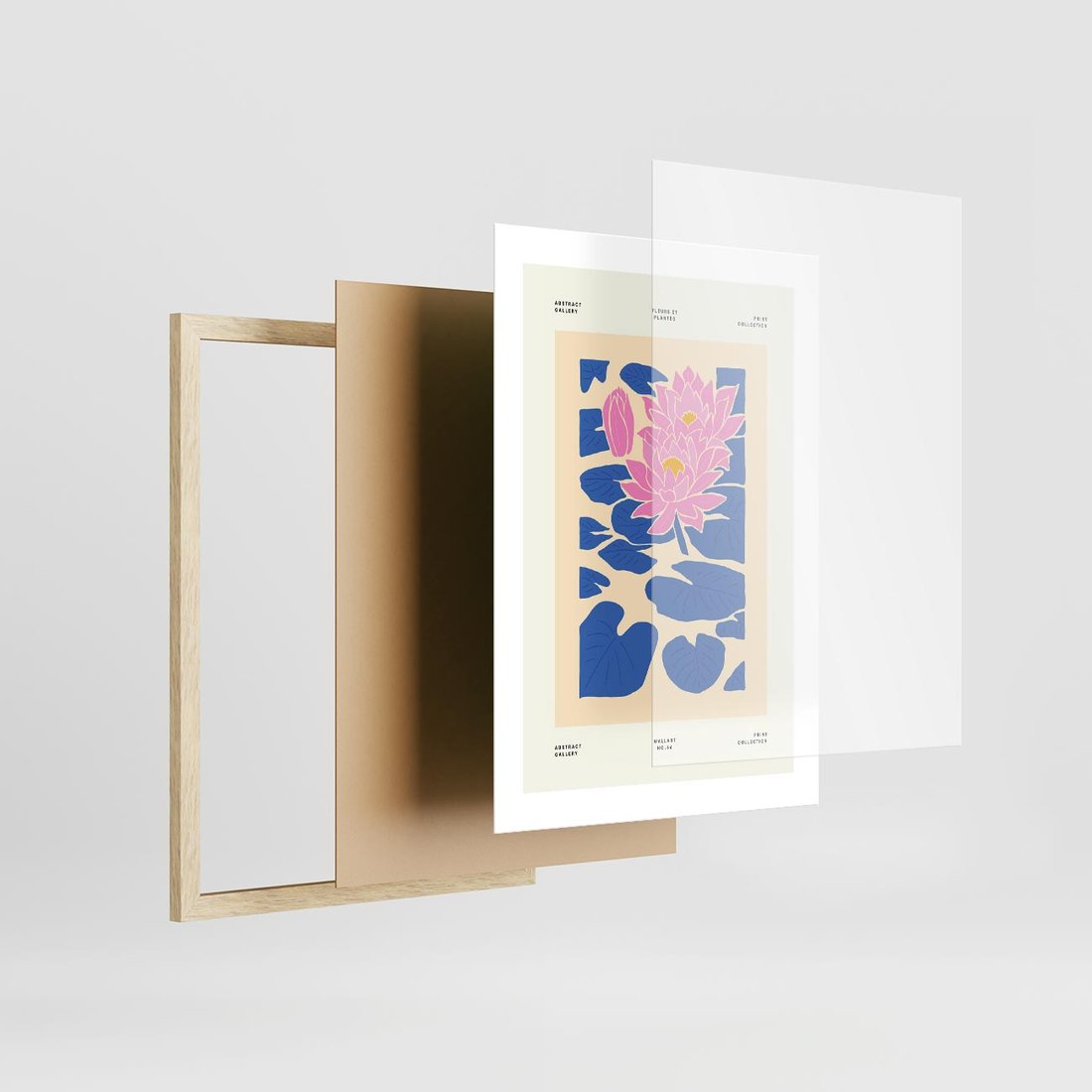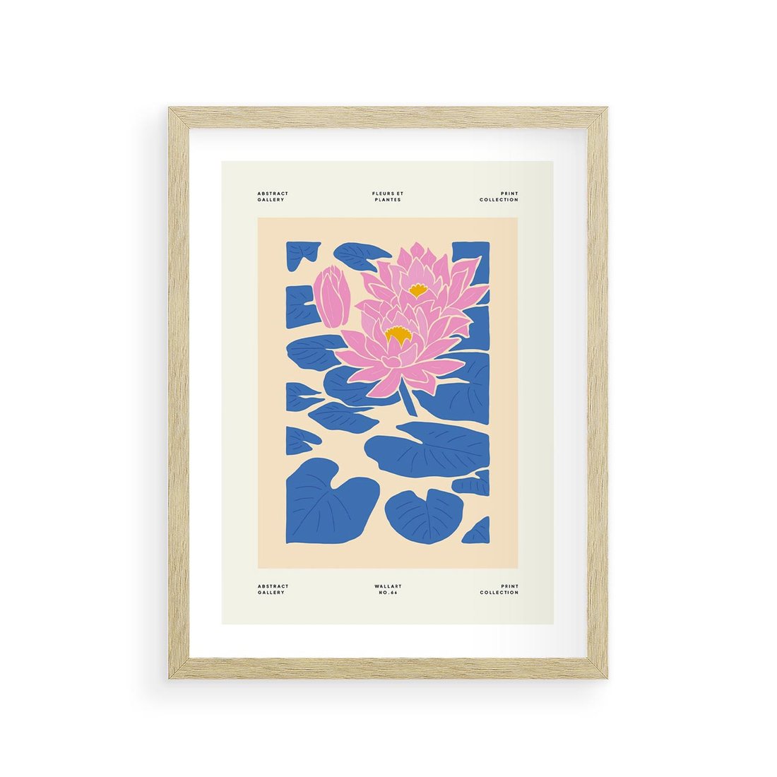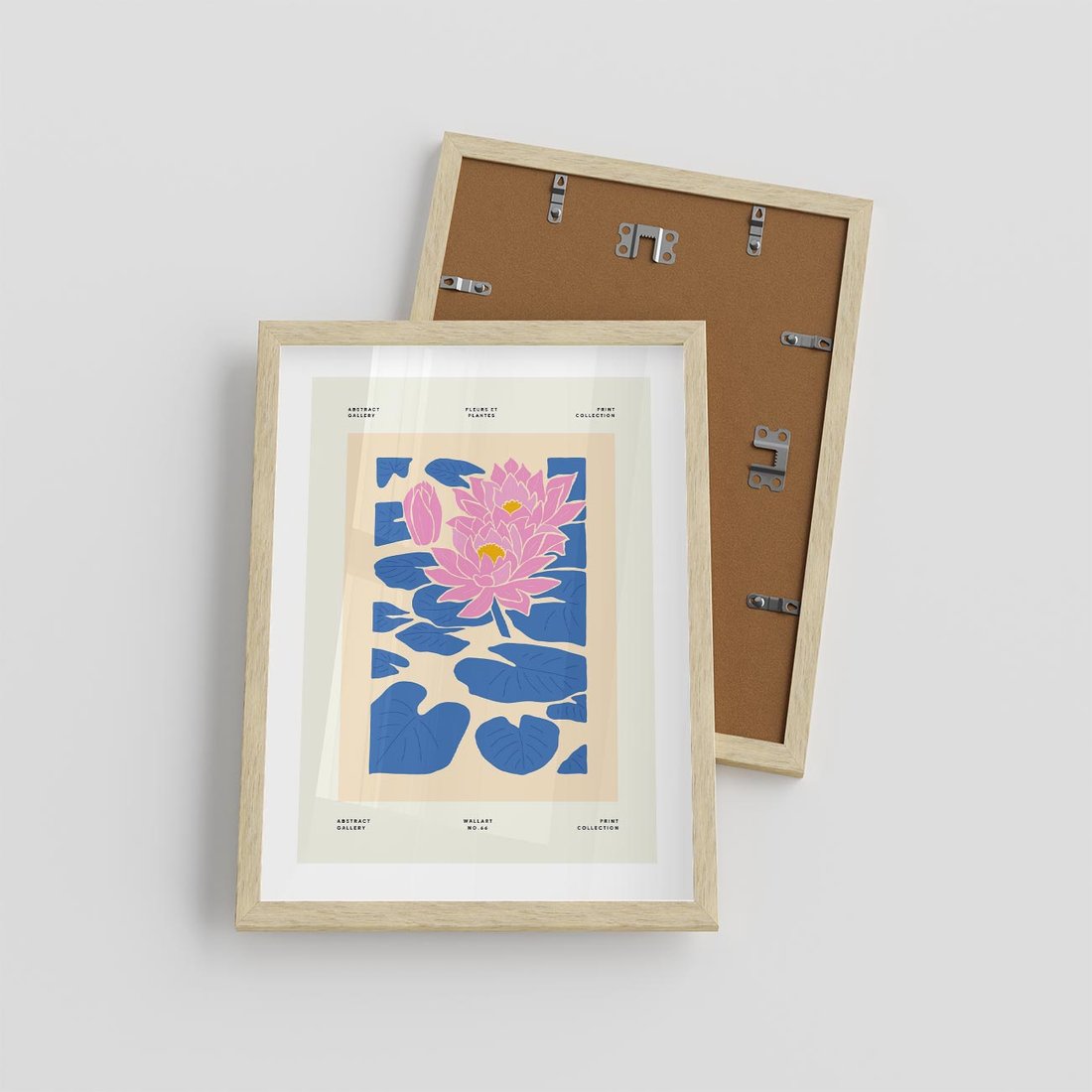 Ten nowoczesny plakat ukazuje pastelowe lilie wodne w odcieniach błękitu i różu, tworząc spokojny i oniryczny obraz. Sztuka ta jest idealnym dodatkiem do sypialni, tworząc atmosferę sennej harmonii i piękna natury.