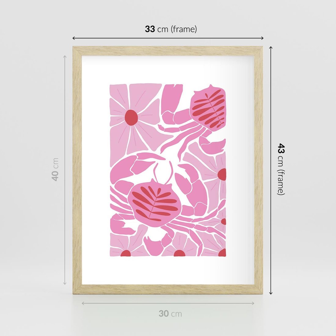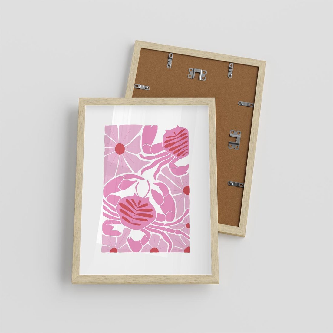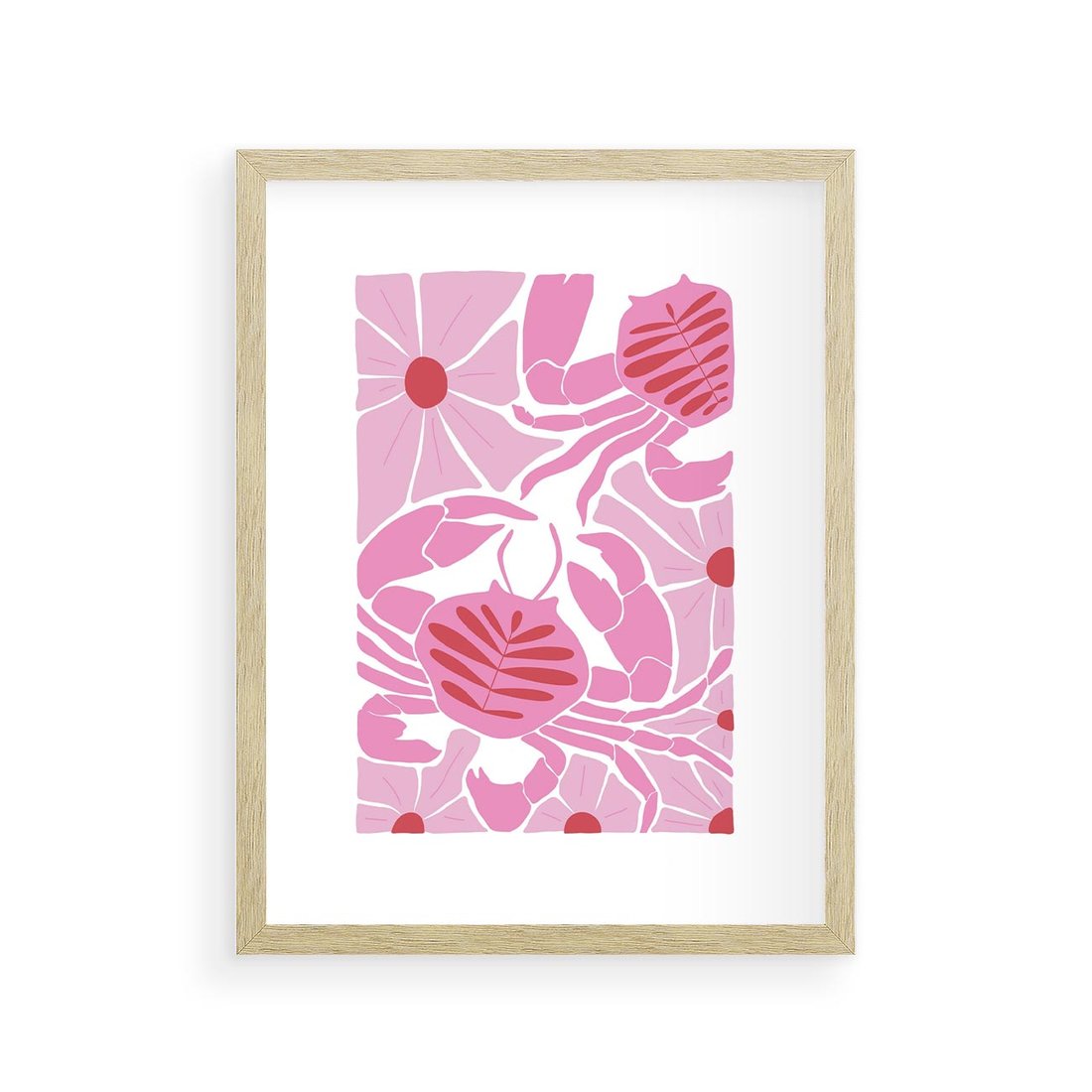 Plakat w ramie 30x40 - Roztańczone Kraby - różowe kwiaty i kraby, abstrakcyjna kompozycja - rama drewno