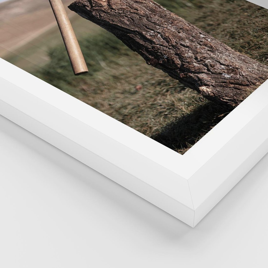 Plakat w ramie 30x40 - Rustykalna Praktyczność: Fotografia Siekiery - rustykalna fotografia, siekiera wbita w pieniek - rama biała