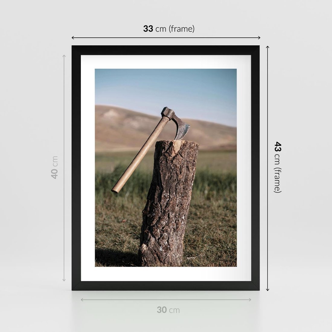 Plakat w ramie 30x40 - Rustykalna Praktyczność: Fotografia Siekiery - rustykalna fotografia, siekiera wbita w pieniek - rama czarna