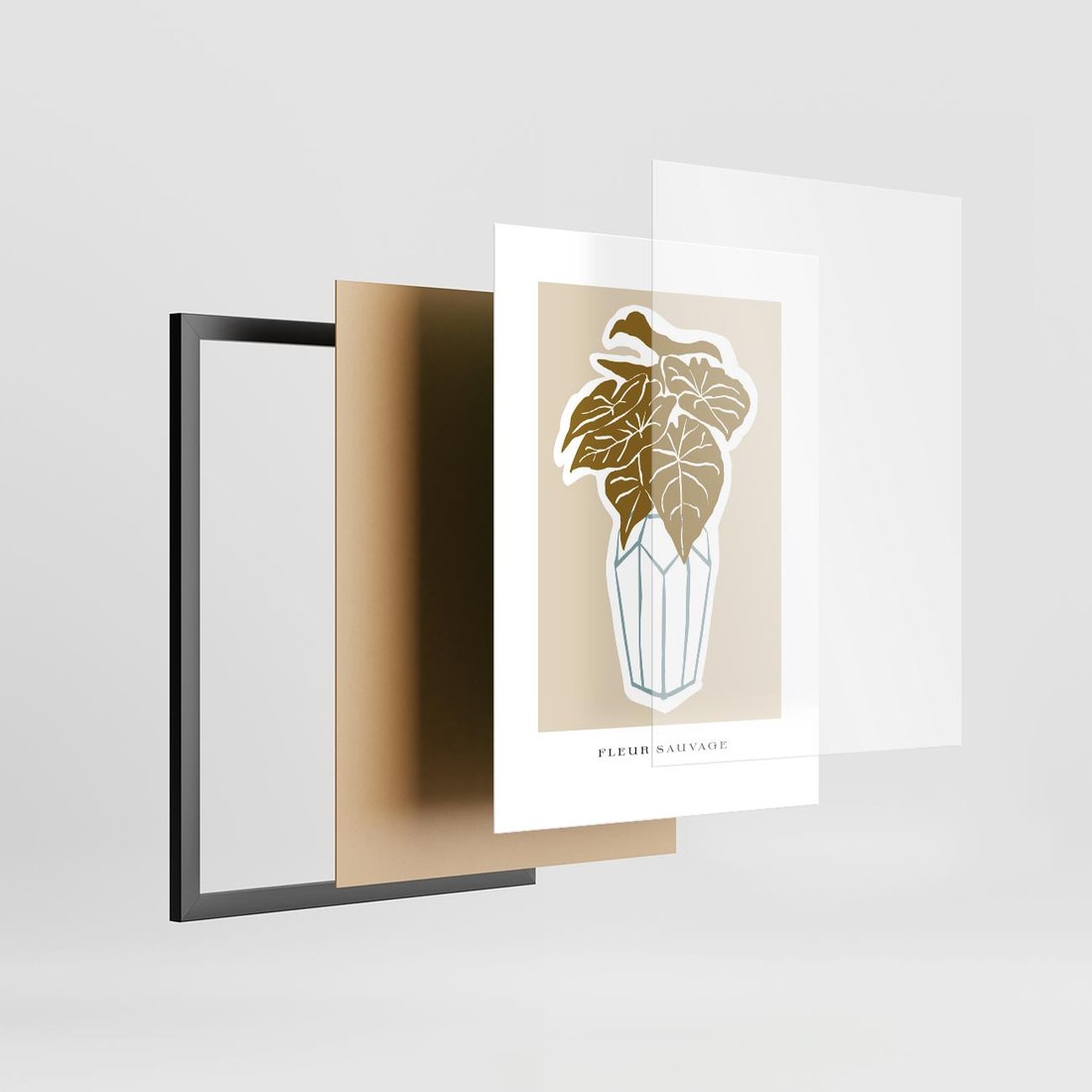 Ten plakat prezentuje abstrakcyjne, tropikalne liście w minimalistycznym wazonie, uzupełnione delikatną typografią. Sztuka ta eksploruje formy liści w sposób abstrakcyjny, tworząc spokojną i równocześnie ekspresyjną kompozycję. Poprzez wykorzystanie minimalizmu, plakat staje się unikalnym elementem dekoracyjnym, który wprowadza do Twojej przestrzeni zarówno naturalny urok, jak i artystyczną atmosferę.