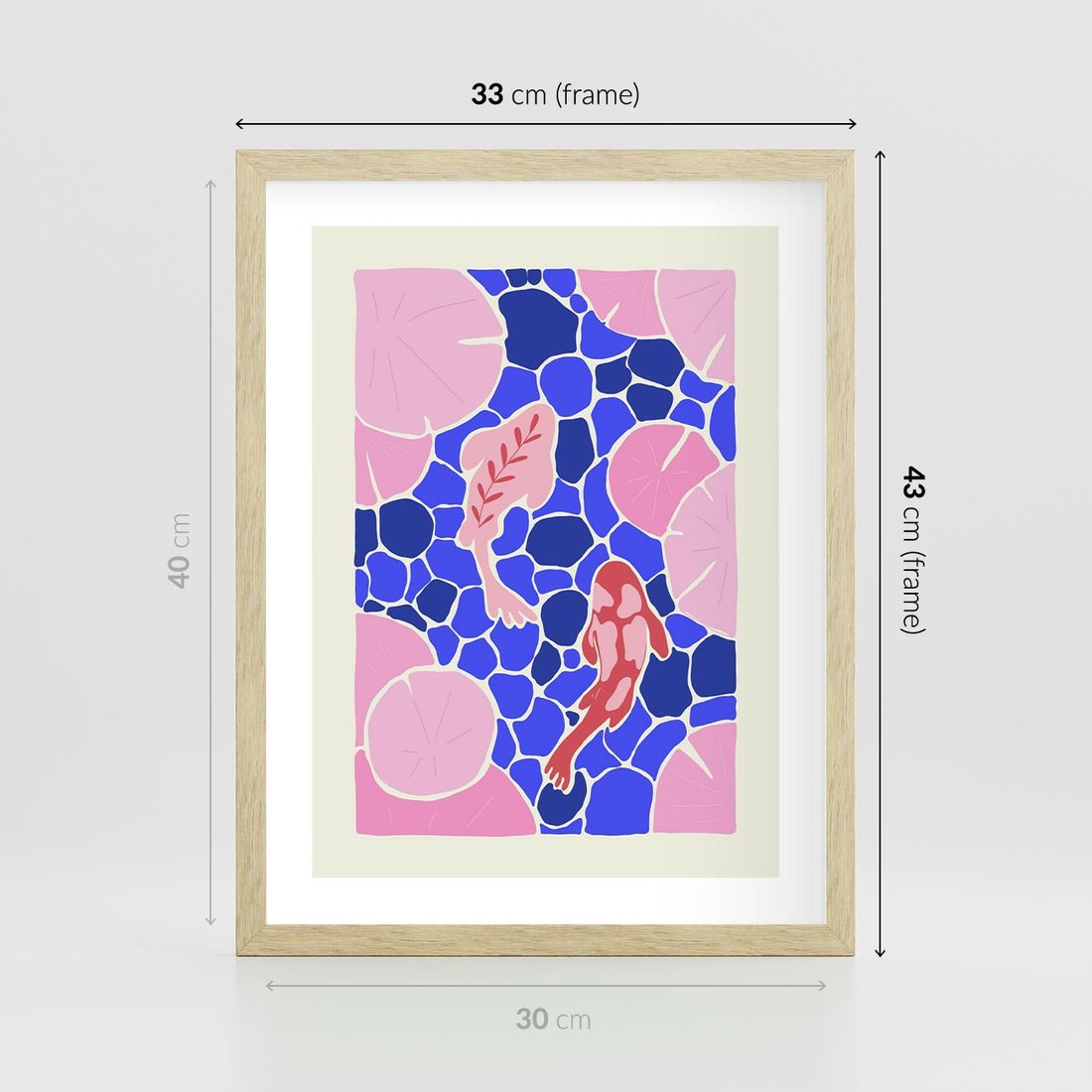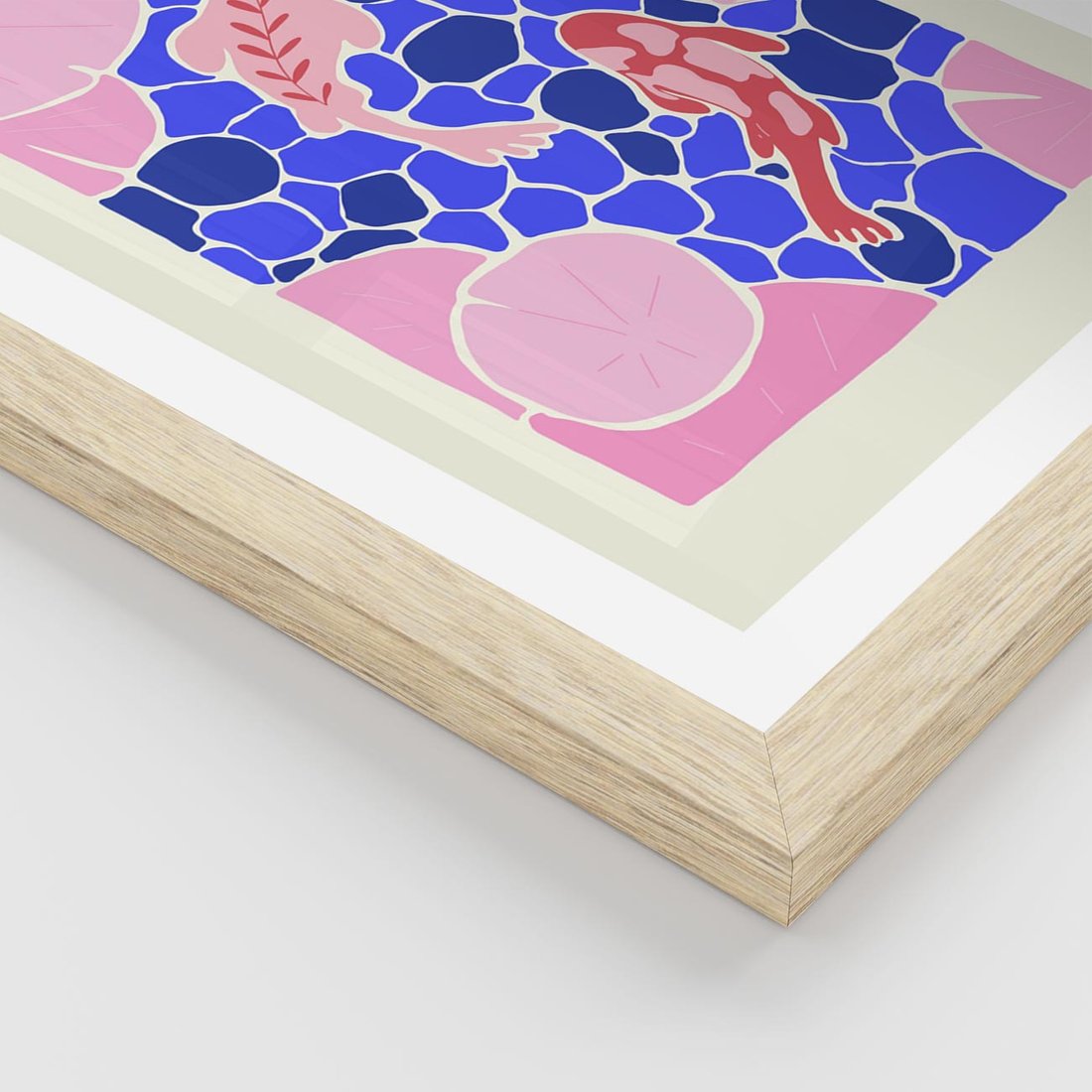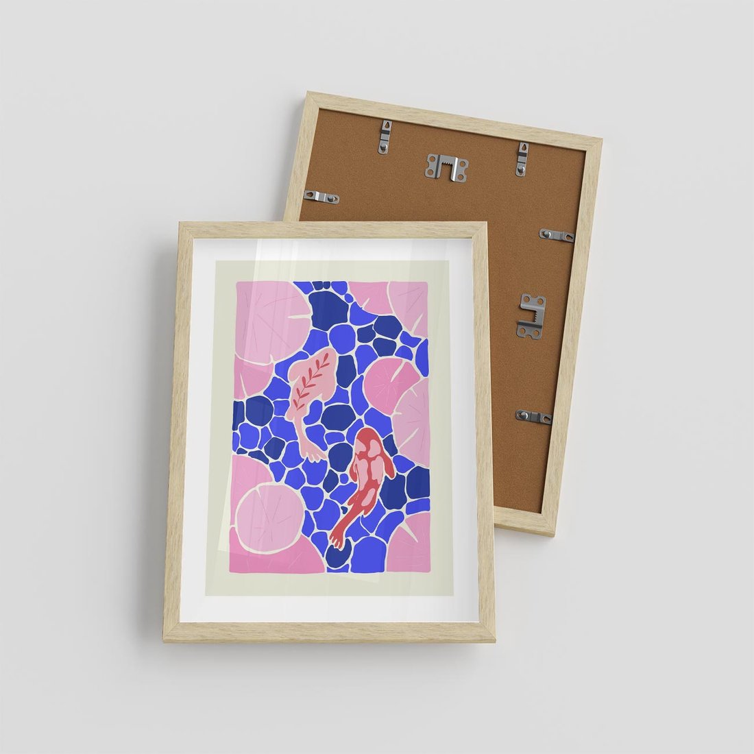 Plakat w ramie 30x40 - Rzeka Abstrakcji - abstrakcyjna kompozycja, różowe ryby wśród rafy - rama drewno