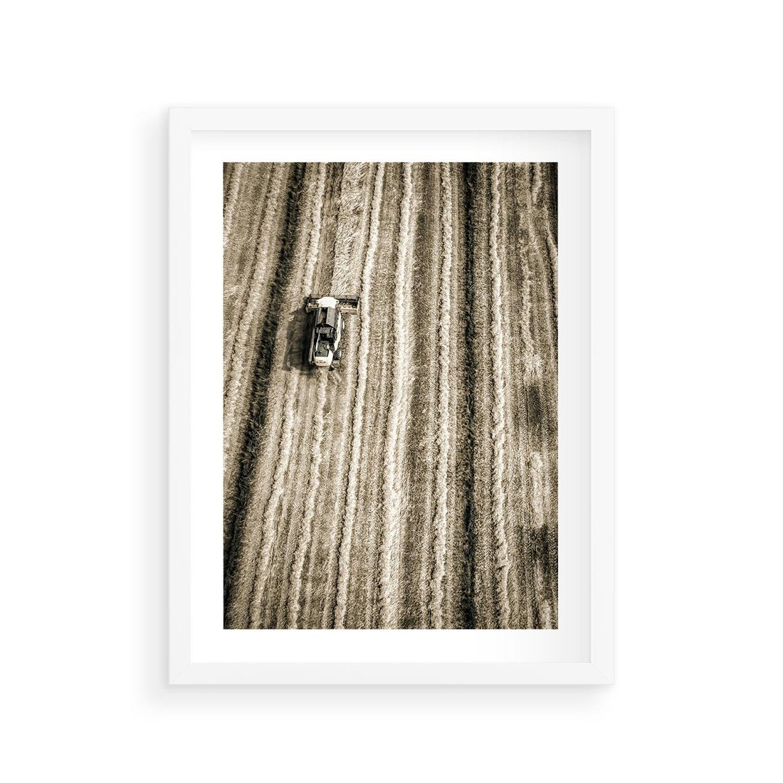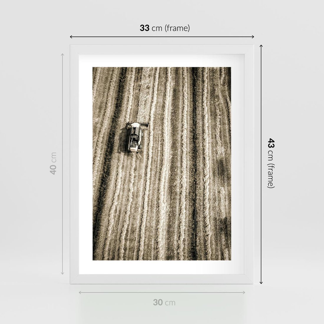 Plakat w ramie 30x40 - Sepia na Polu - kombajn, pole - rama biała