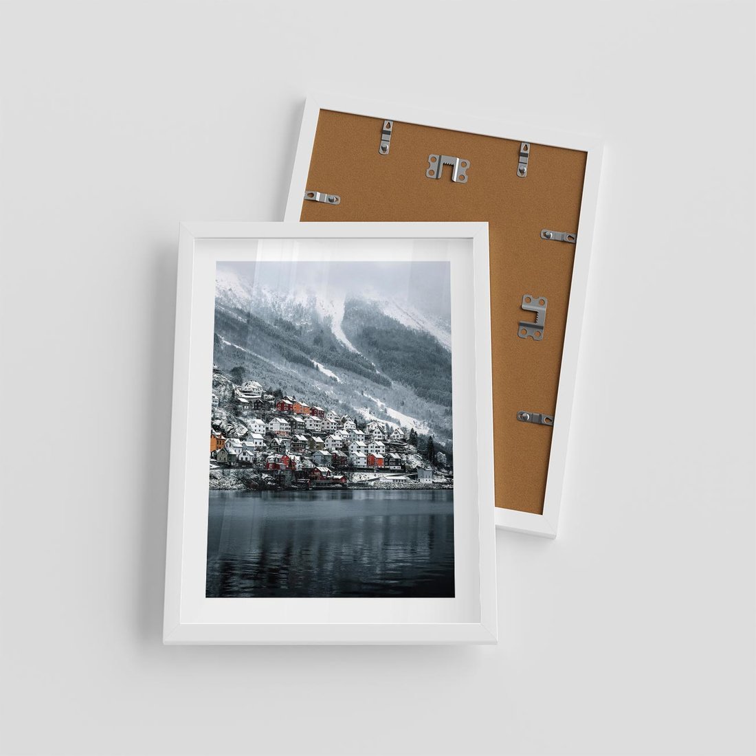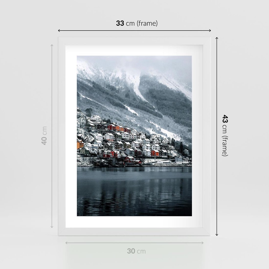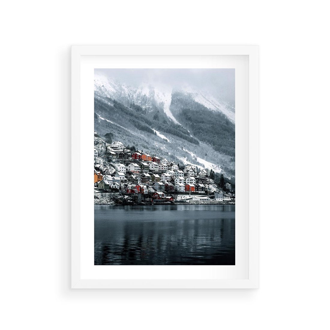 Plakat w ramie 30x40 - Skandynawia na Wzgórzach - domki na wzgórzu, skandynawia - rama biała