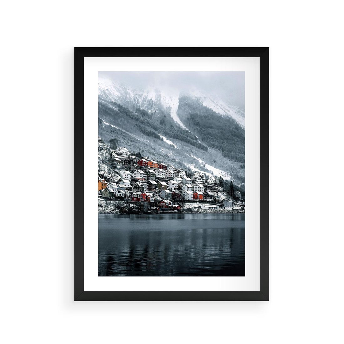 Plakat w ramie 30x40 - Skandynawia na Wzgórzach - domki na wzgórzu, skandynawia - rama czarna