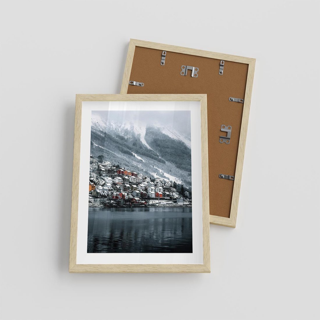 Plakat w ramie 30x40 - Skandynawia na Wzgórzach - domki na wzgórzu, skandynawia - rama drewno