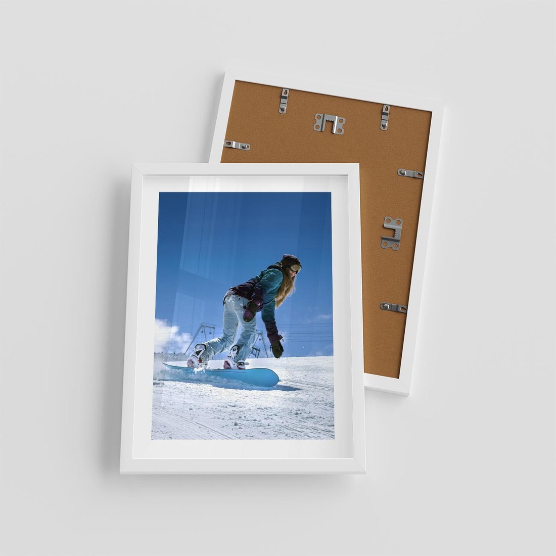 Plakat w ramie 30x40 - Snowboard na zimowych zboczach - snowboard, zima - rama biała