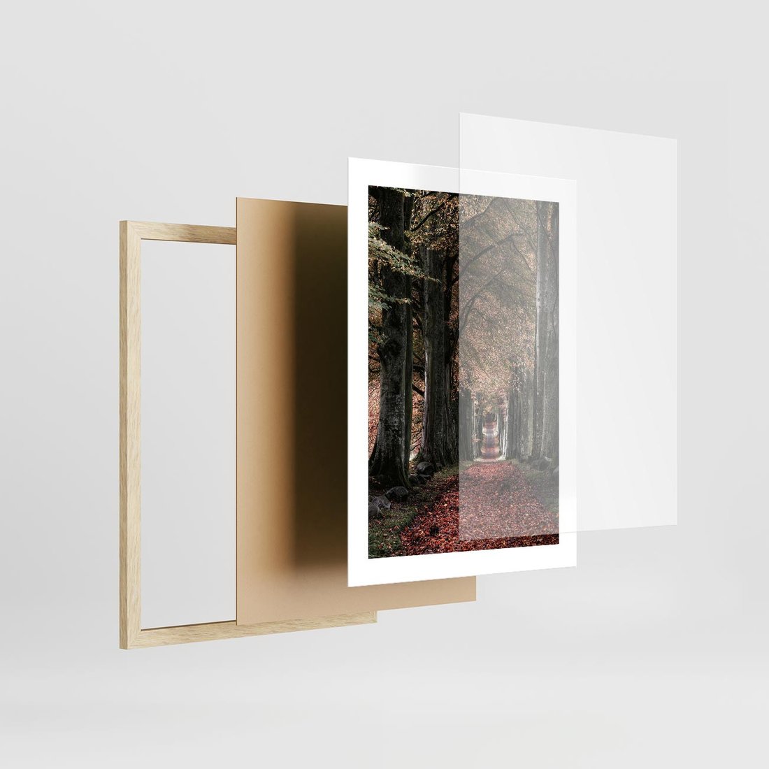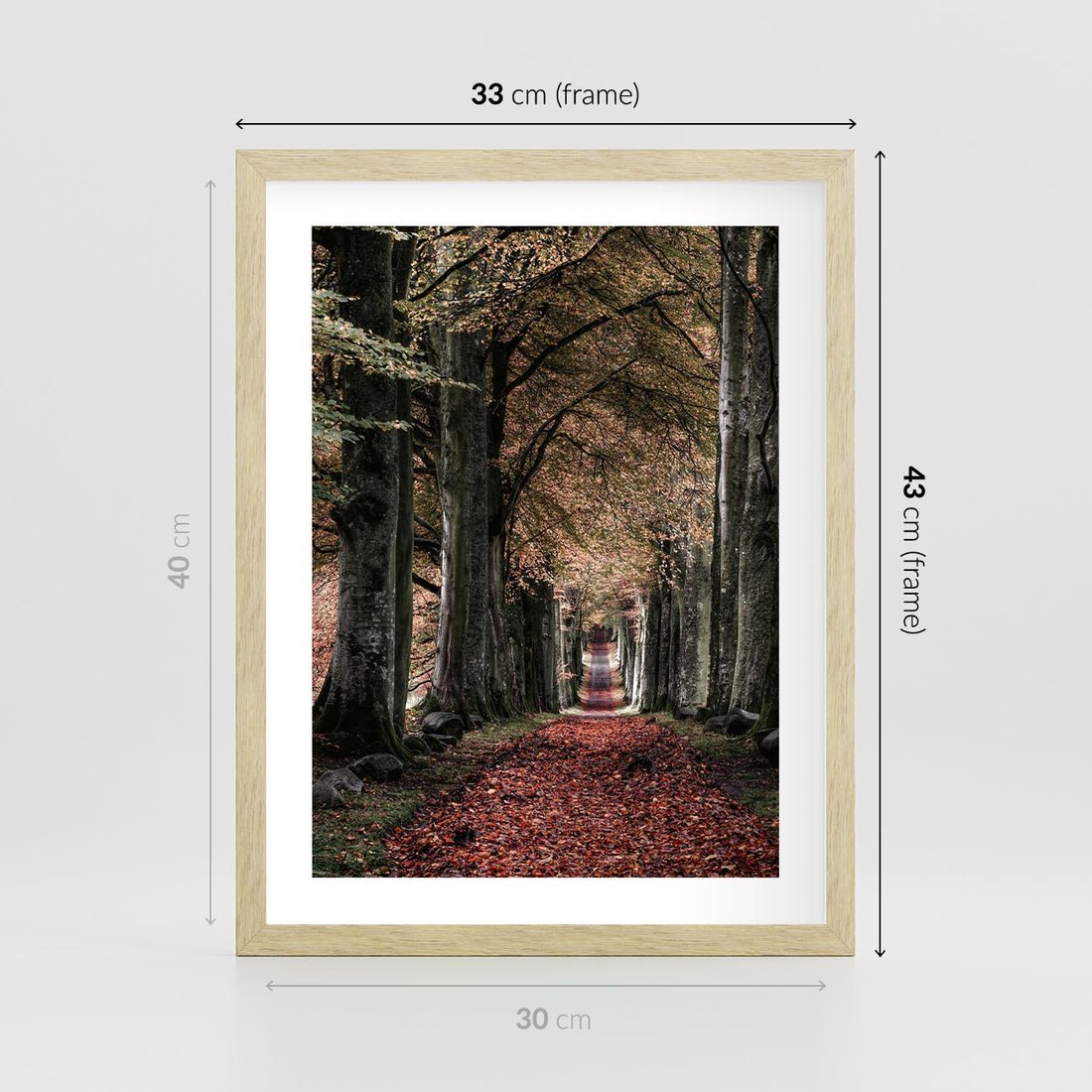 Plakat w ramie 30x40 - Spacer po Leśnej Drodze - ścieżka w lesie, jesień suche liście - rama drewno