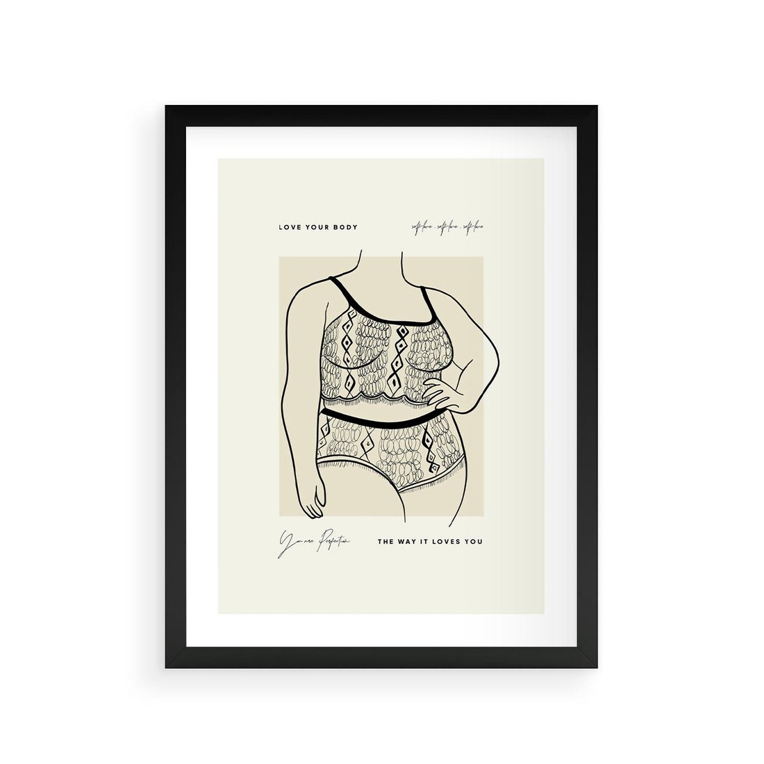 Ten plakat to hołd dla kobiecej siły i piękna. Delikatny rysunek kobiety w bieliźnie, wzbogacony subtelnie dobraną typografią, tworzy wyjątkową kompozycję, oddającą piękno i pewność siebie.