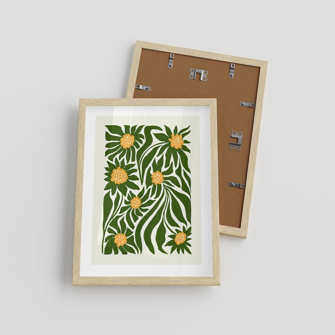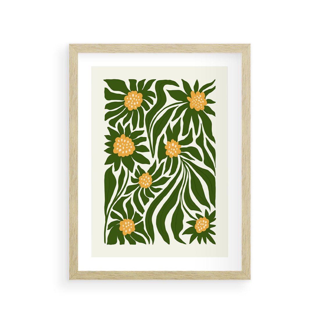Ta abstrakcyjna kompozycja ukazuje kwiaty w wyjątkowo niekonwencjonalny sposób. Zieleń i żółć splatają się w harmonijną całość, tworząc abstrakcyjne pejzaże natury. Bez tytułu obraz zachęca do indywidualnych interpretacji, pozostawiając przestrzeń dla wyobraźni i refleksji.
