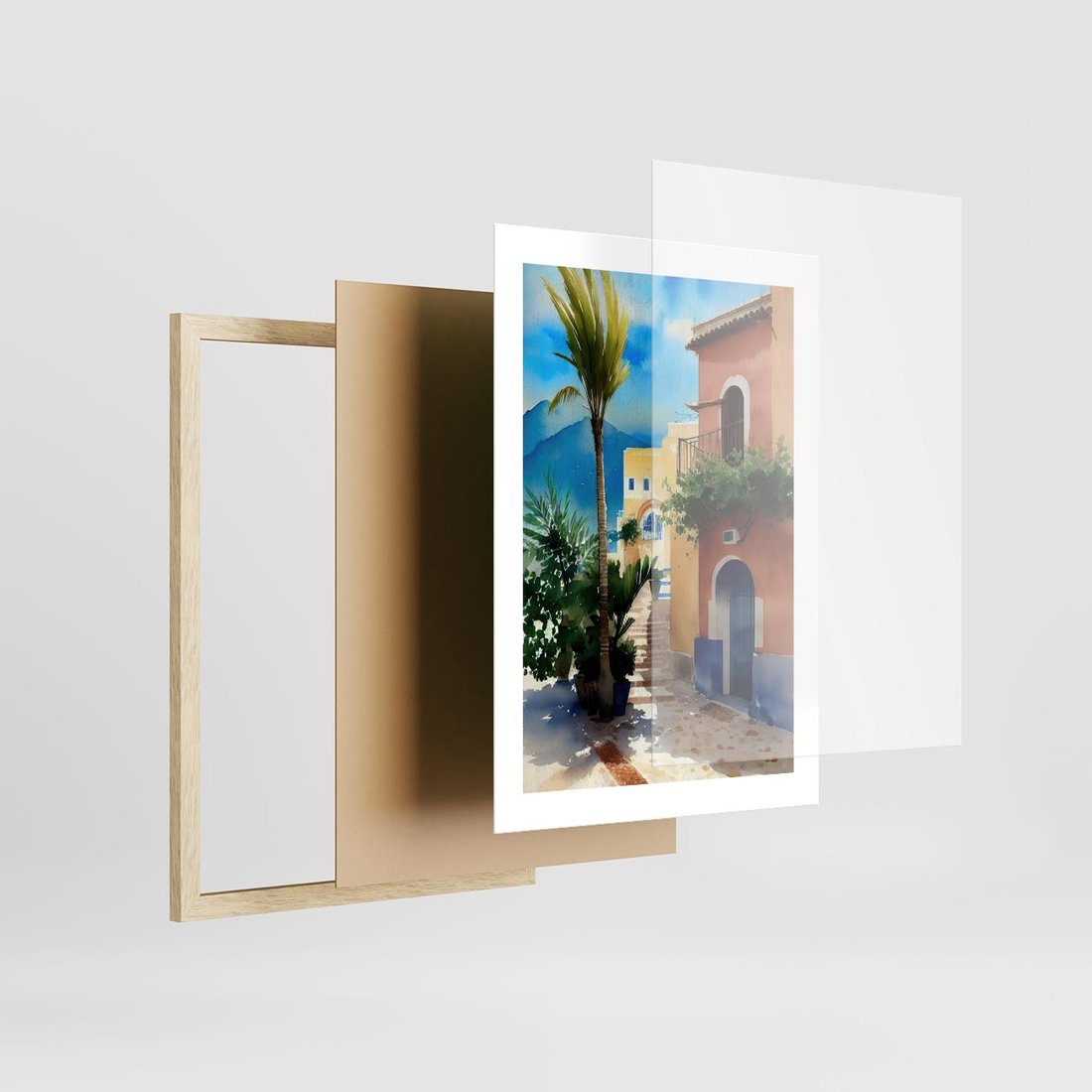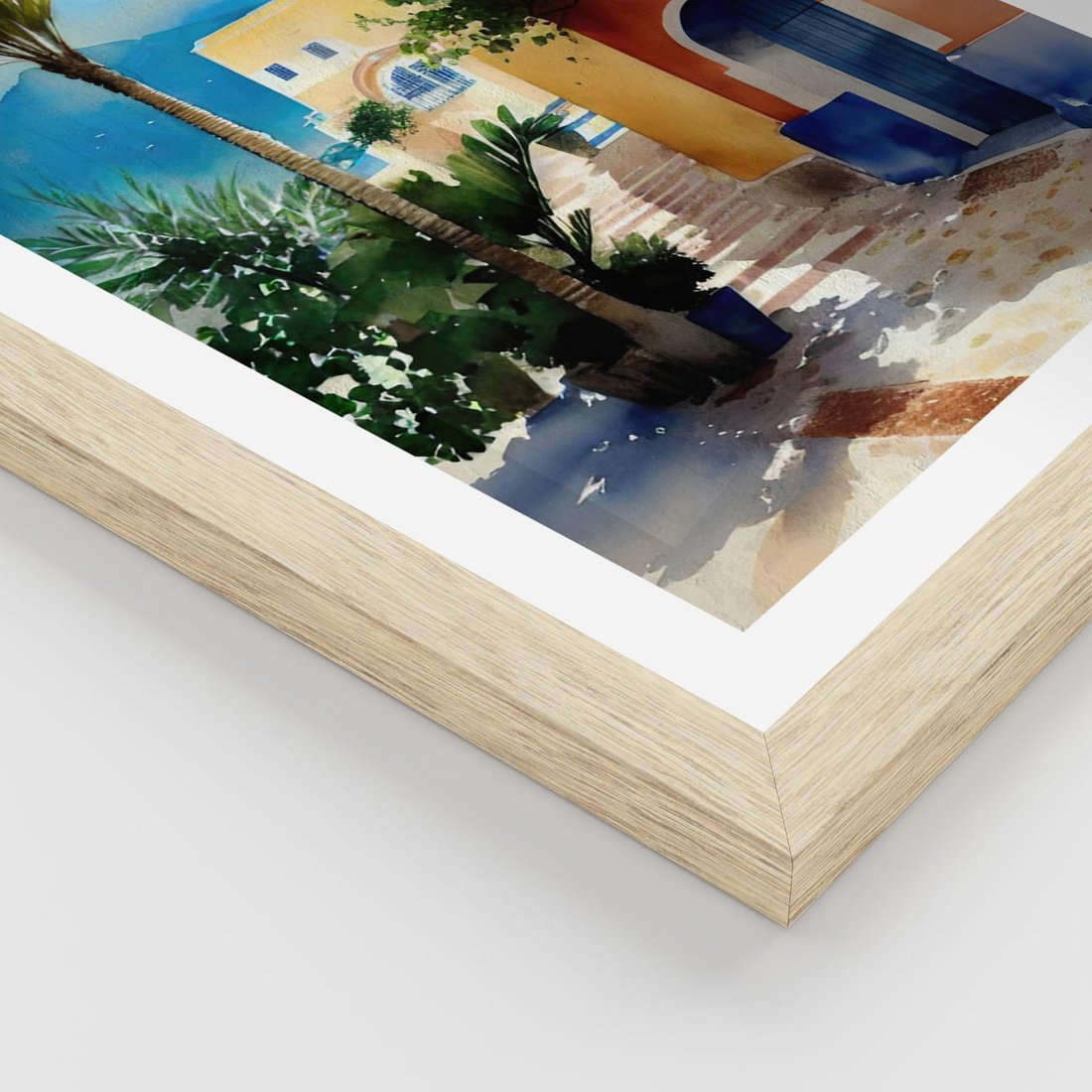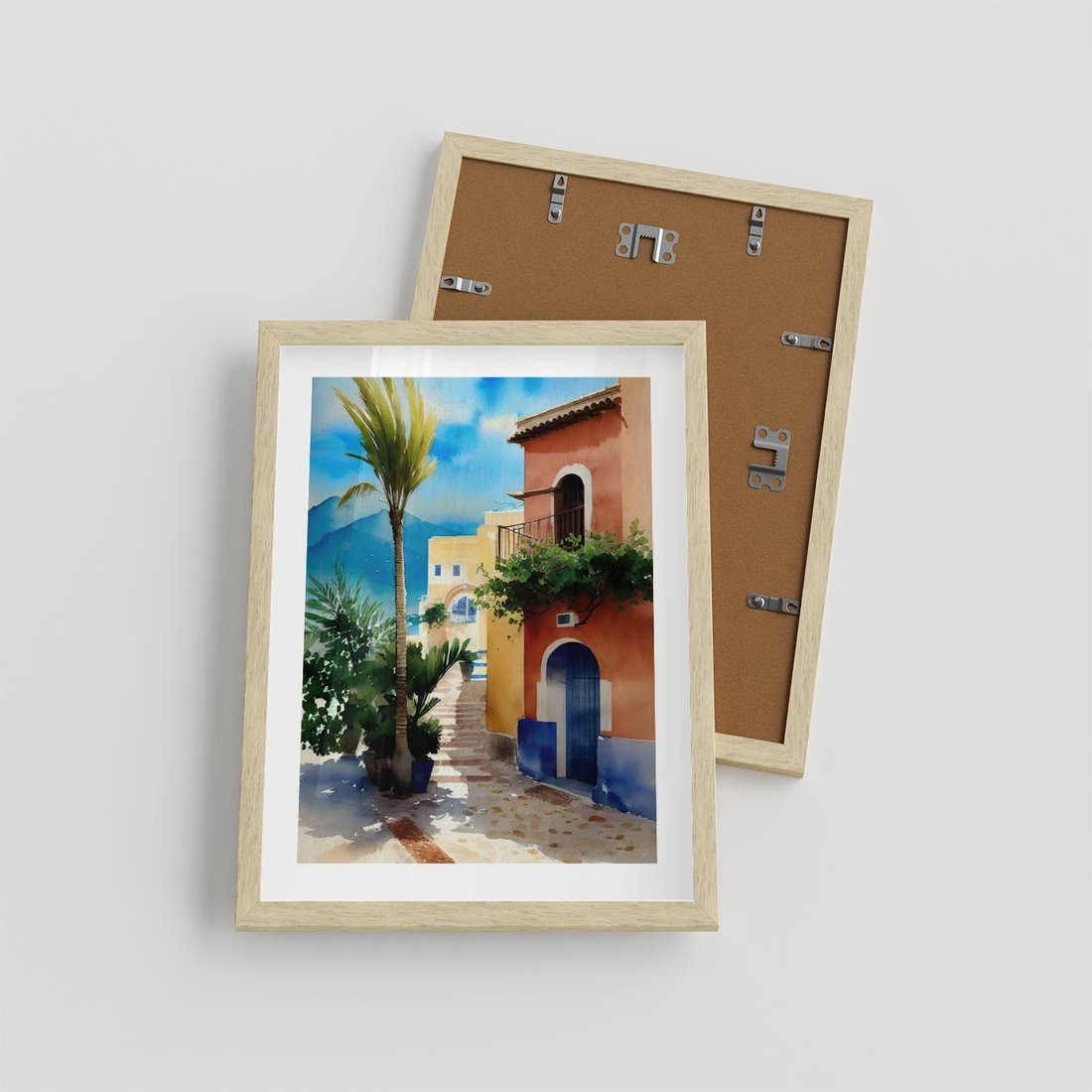 Plakat w ramie 30x40 - Spokój Miasta nad Morzem - akwarela, sródziemnomorski klimat - rama drewno