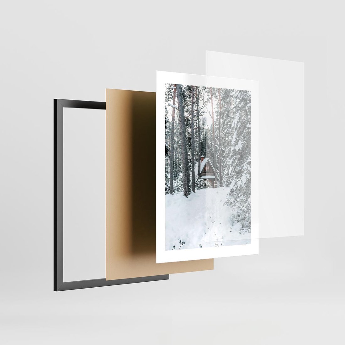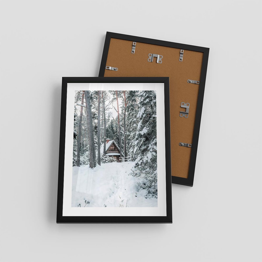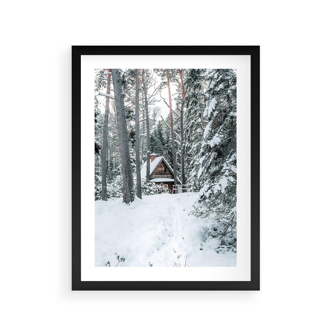 Plakat w ramie 30x40 - Spokój Zimowej Przygody w Lesie - domek w górach w lesie, zima - rama czarna