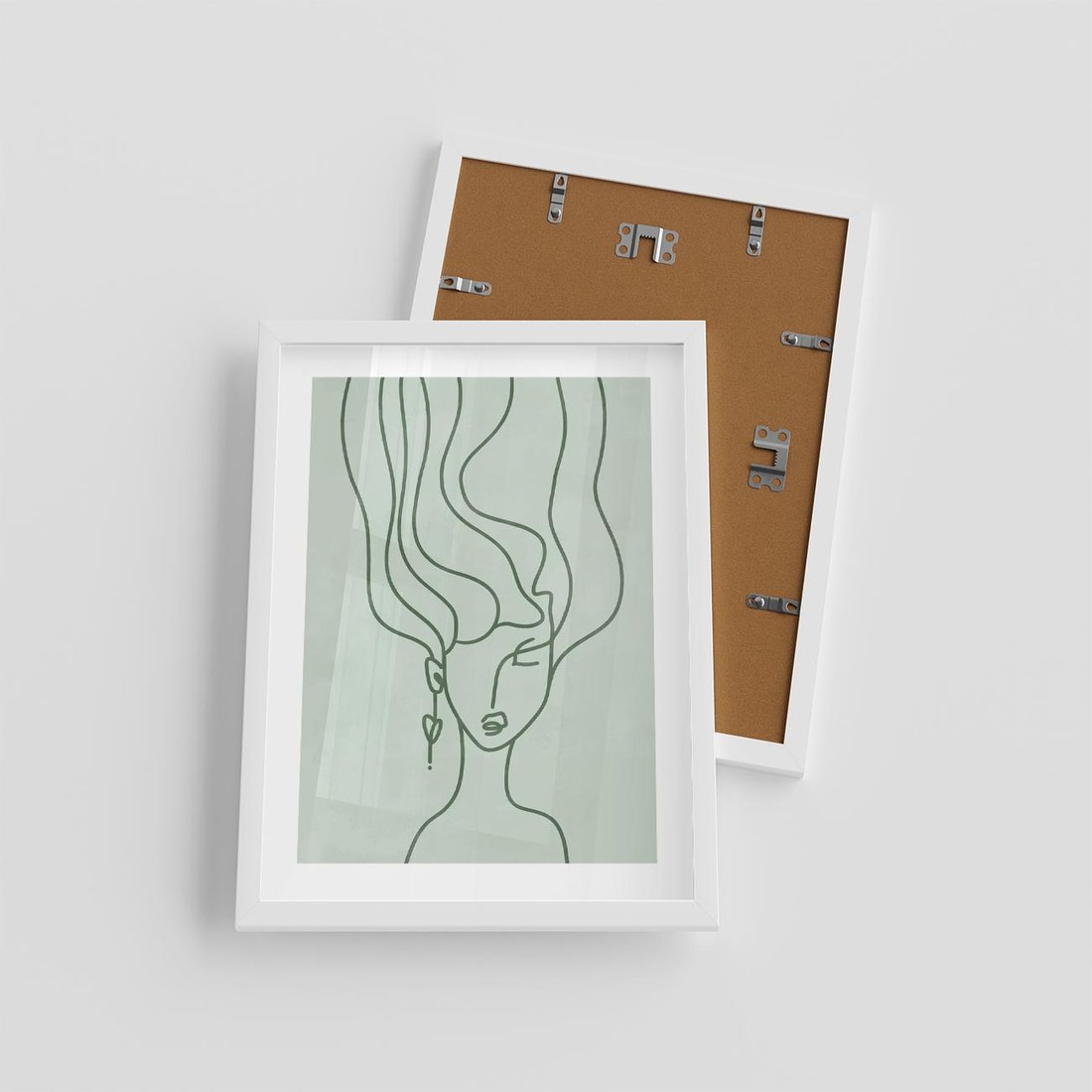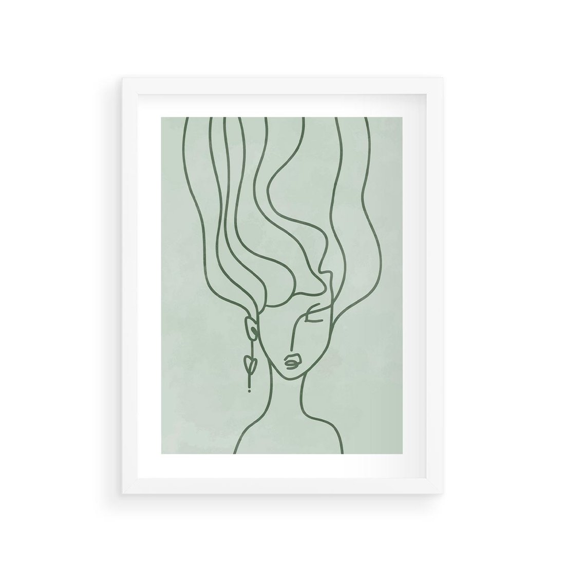 Abstrakcyjny zielony szkic ukazujący kobietę z długimi włosami tworzy wyjątkowy wizualny efekt. Delikatność zielonych linii nadaje kompozycji harmonii, a jednocześnie zachowuje abstrakcyjny charakter, co może ciekawie uzupełnić różne rodzaje wnętrz.