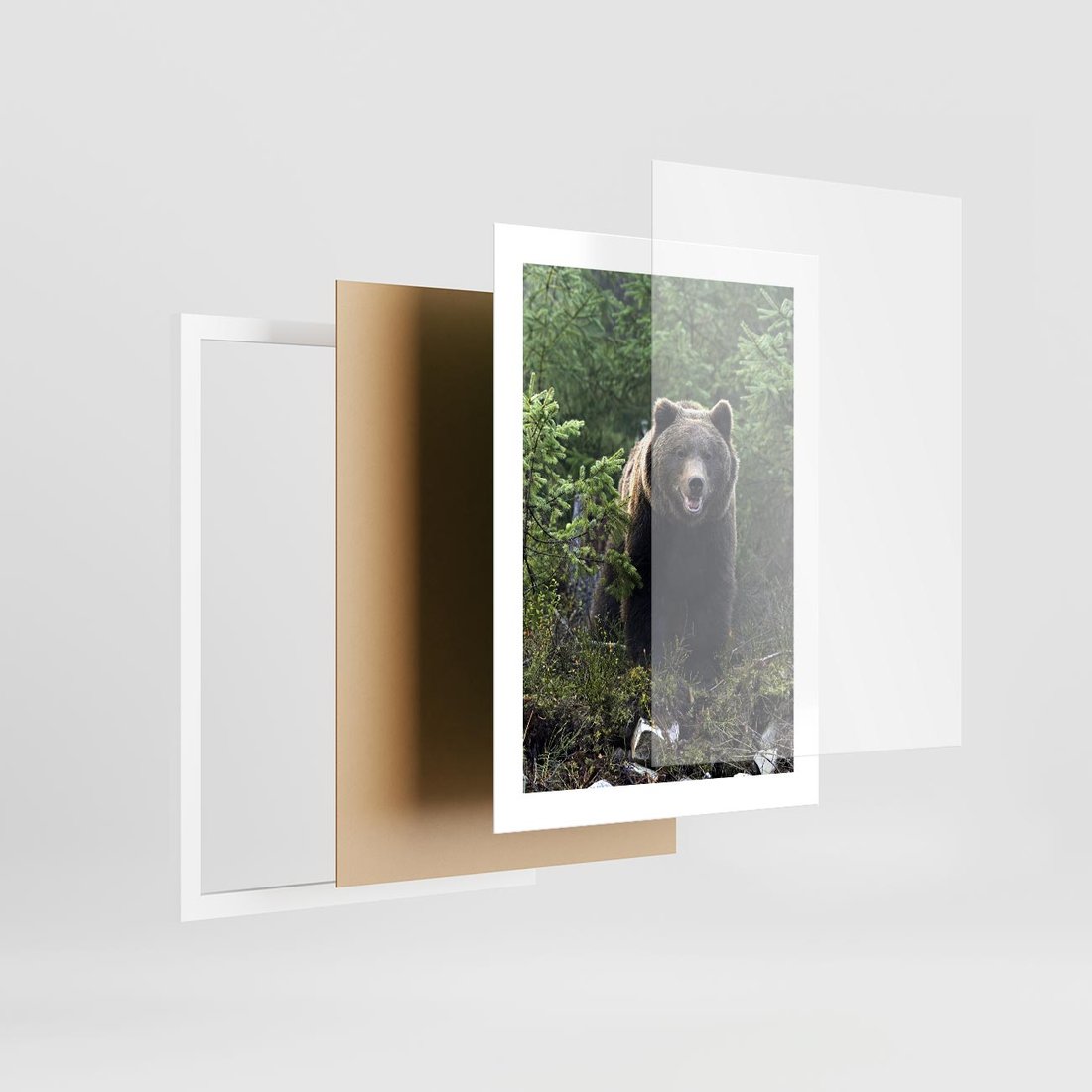 Plakat w ramie 30x40 - Spotkanie z Niedźwiedziem w Lesie - niedźwiedź, las - rama biała