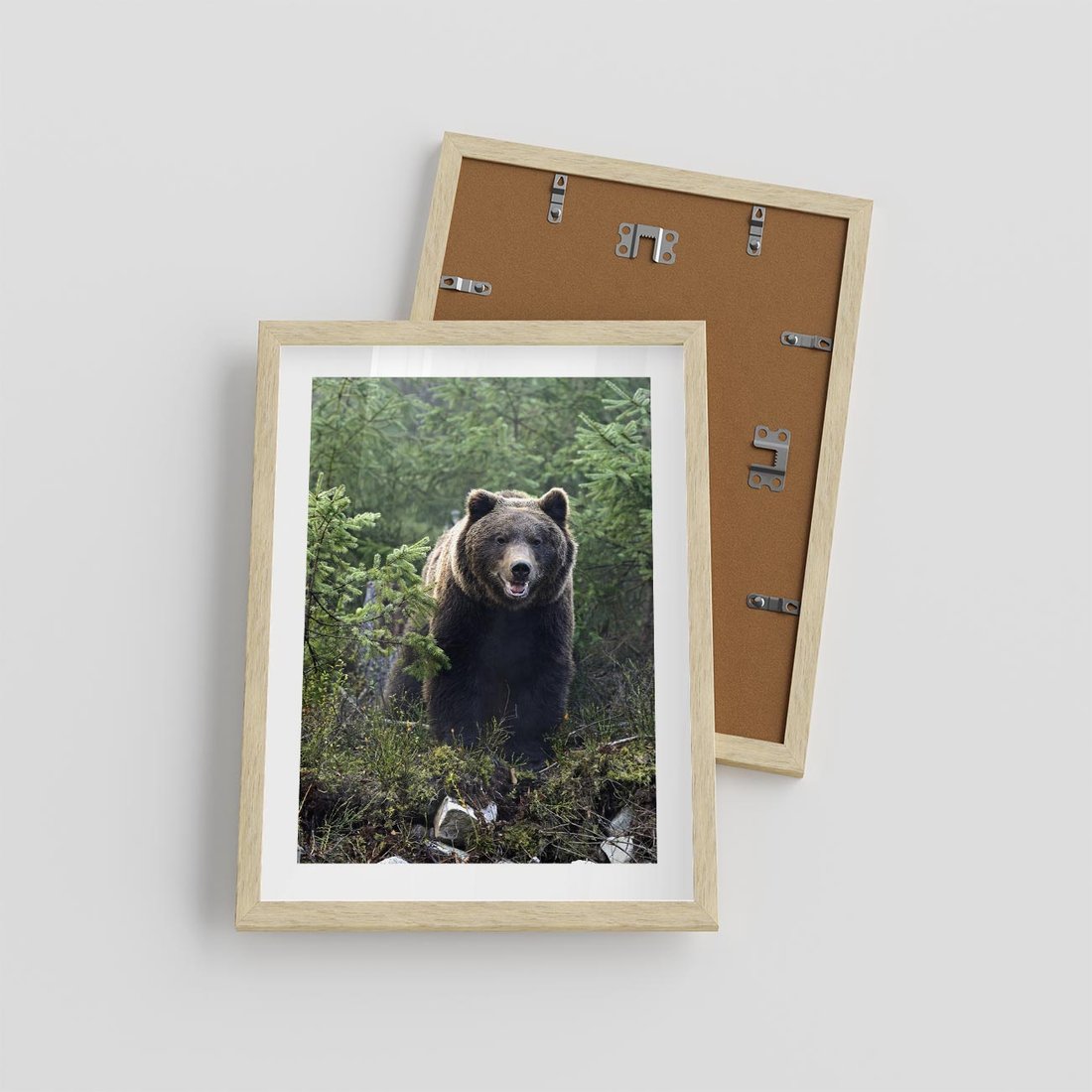 Plakat w ramie 30x40 - Spotkanie z Niedźwiedziem w Lesie - niedźwiedź, las - rama drewno