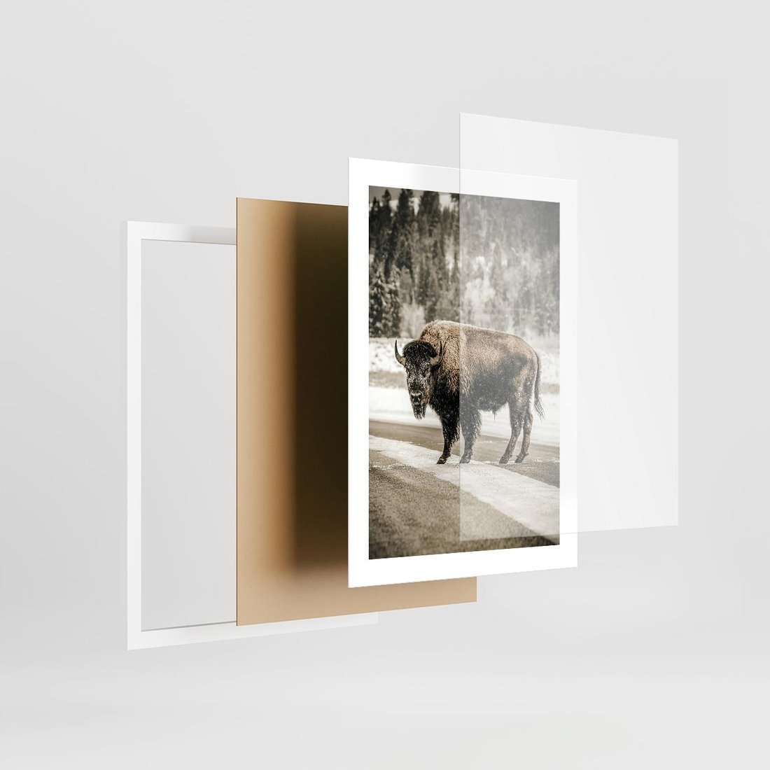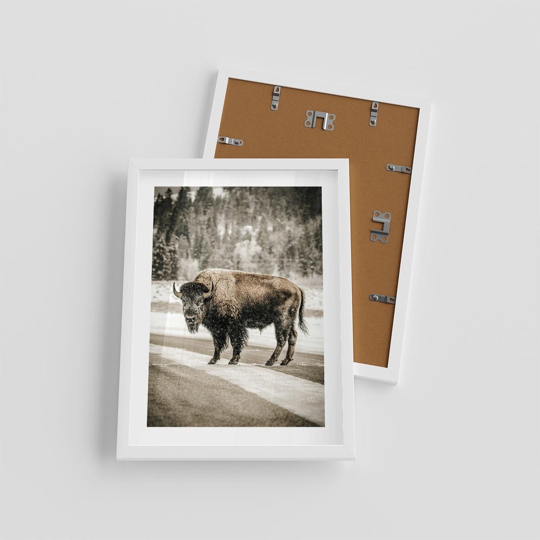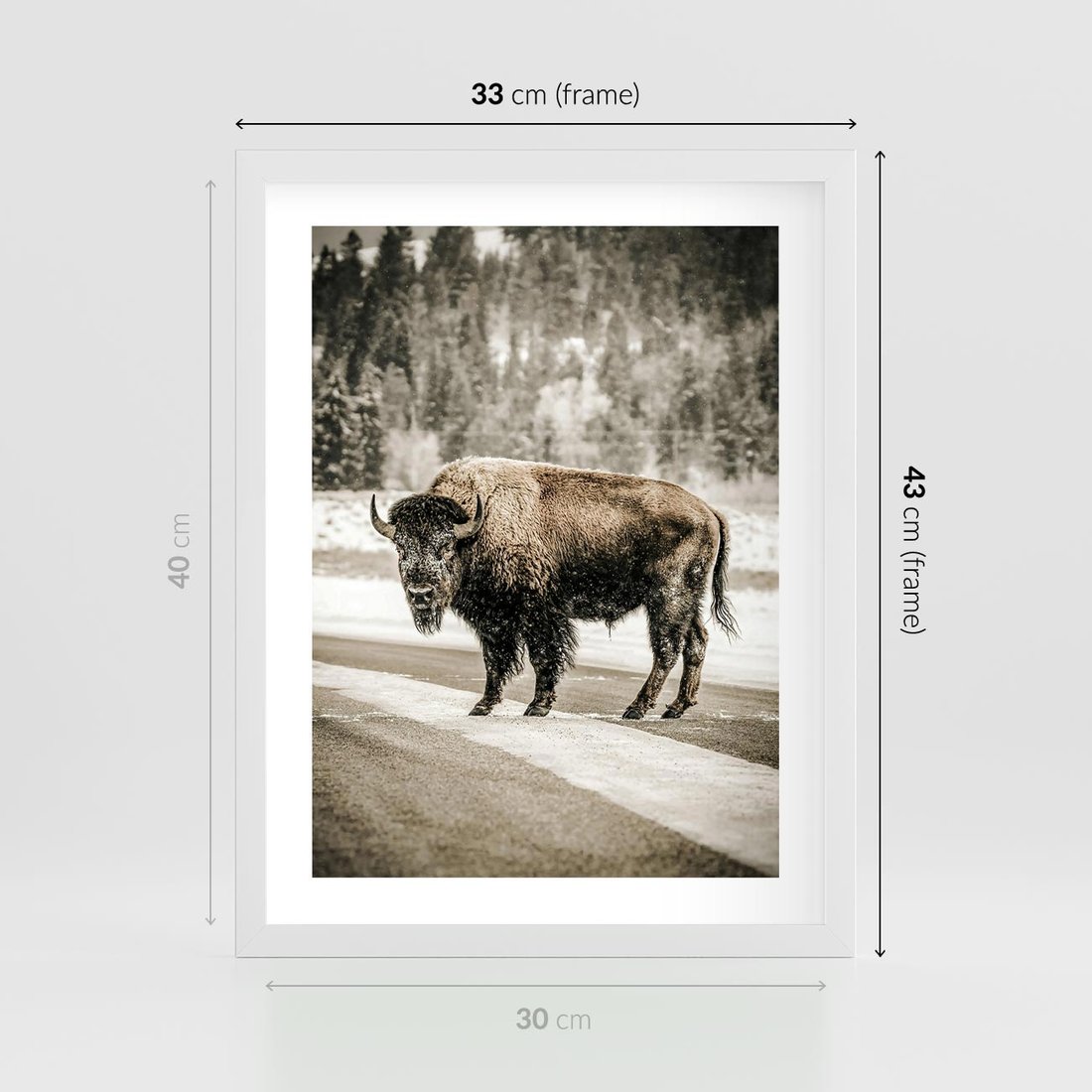 Plakat w ramie 30x40 - Spotkanie z Żubrem na Leśnej Drodze - żubr, las - rama biała