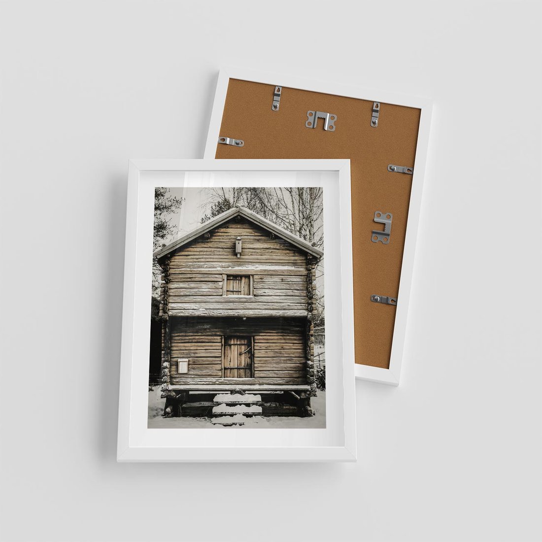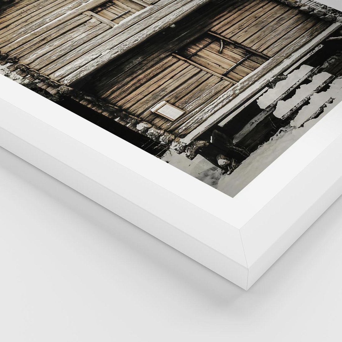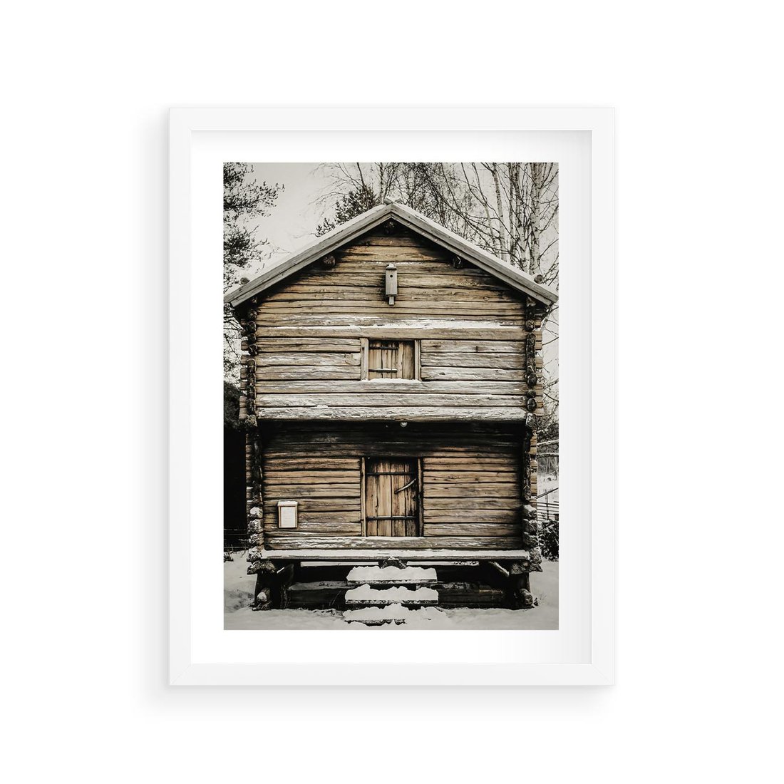 Plakat w ramie 30x40 - Stary Drewniany Dom w Śniegu - stary drewniany dom, zima - rama biała