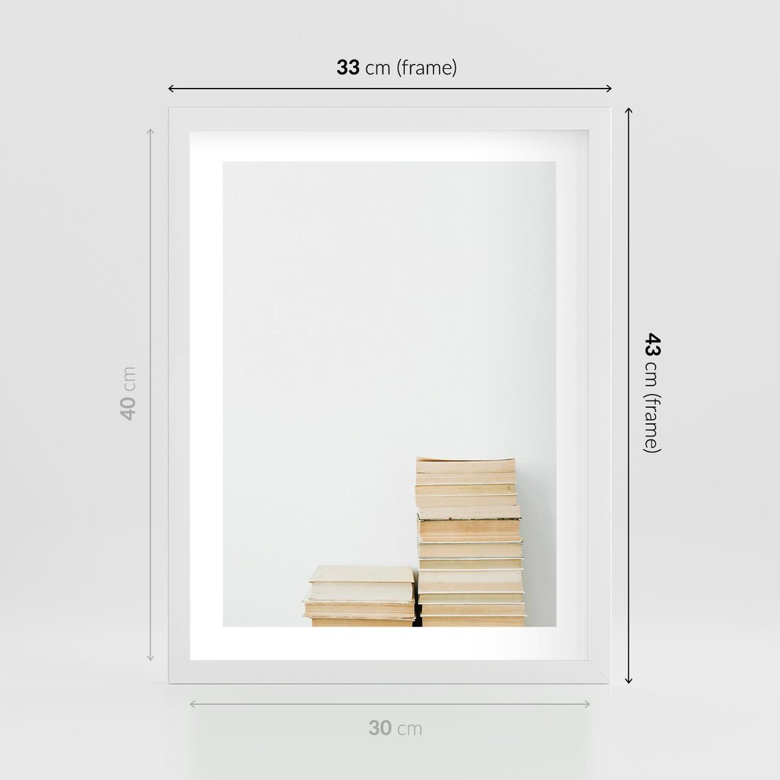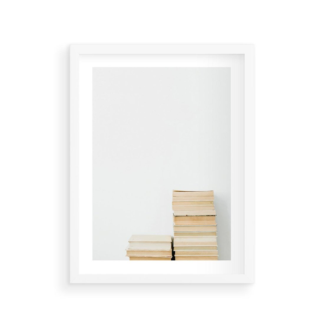 Plakat w ramie 30x40 - Stos Zakurzonych Opowieści - stos książek, ksiązki na stosie - rama biała