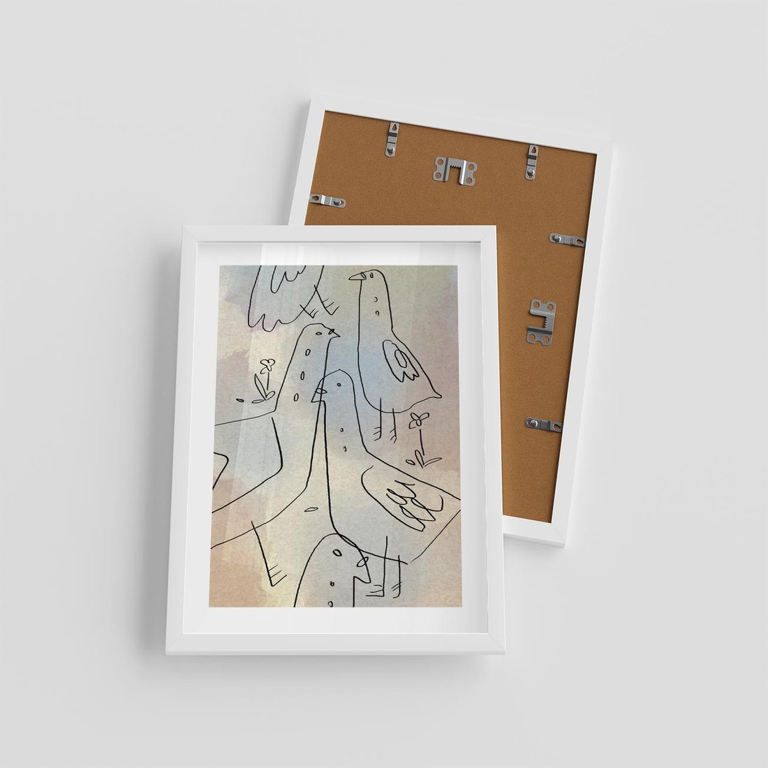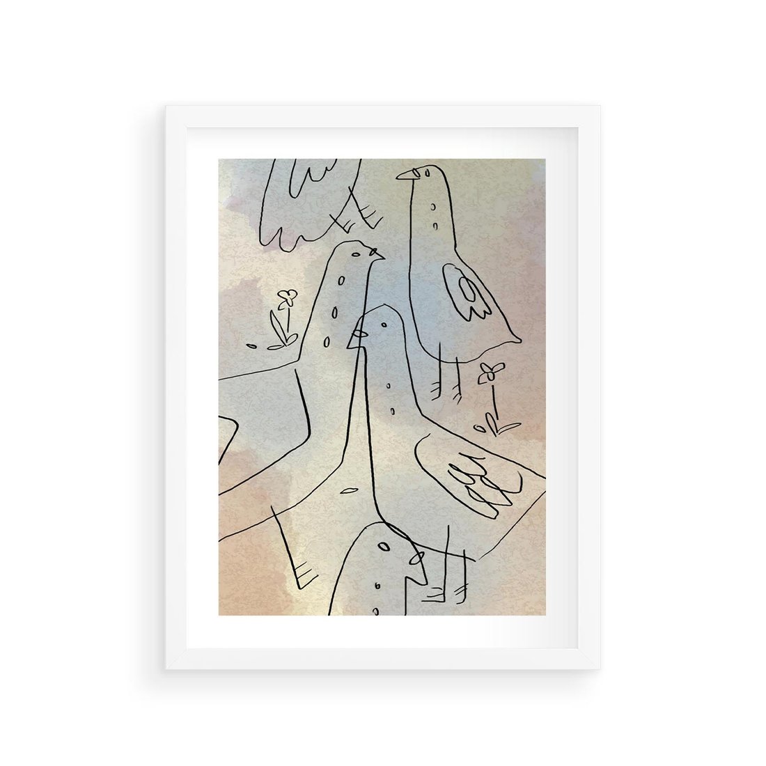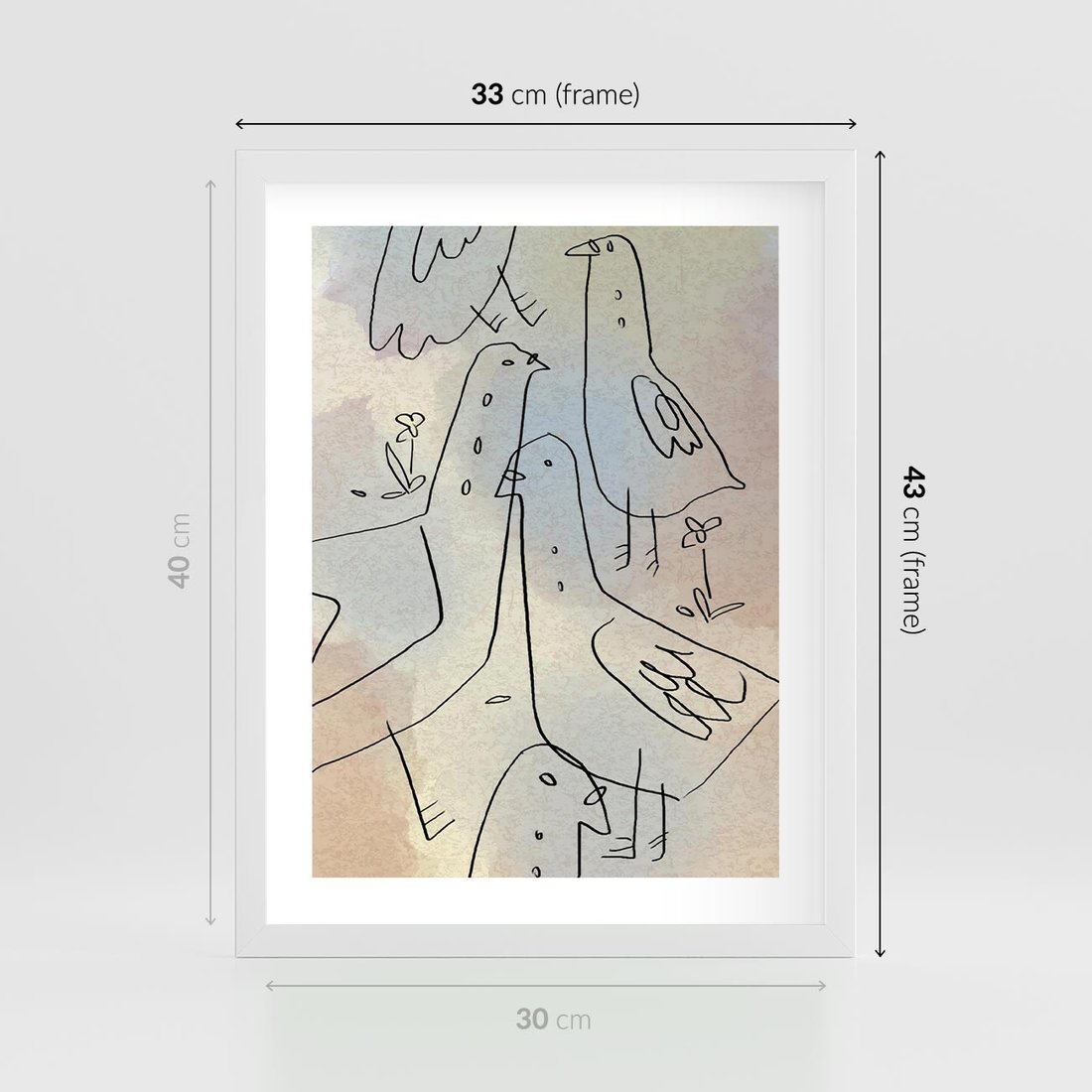 Plakat w ramie 30x40 - Strukturalna Gromada - abstrakcyjny plakat, szkic ptaków - rama biała