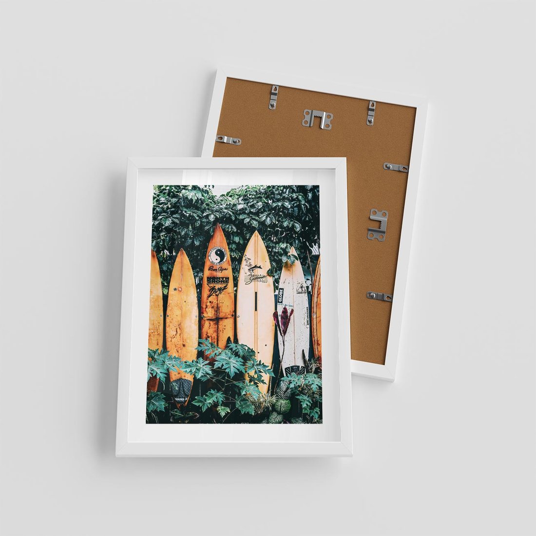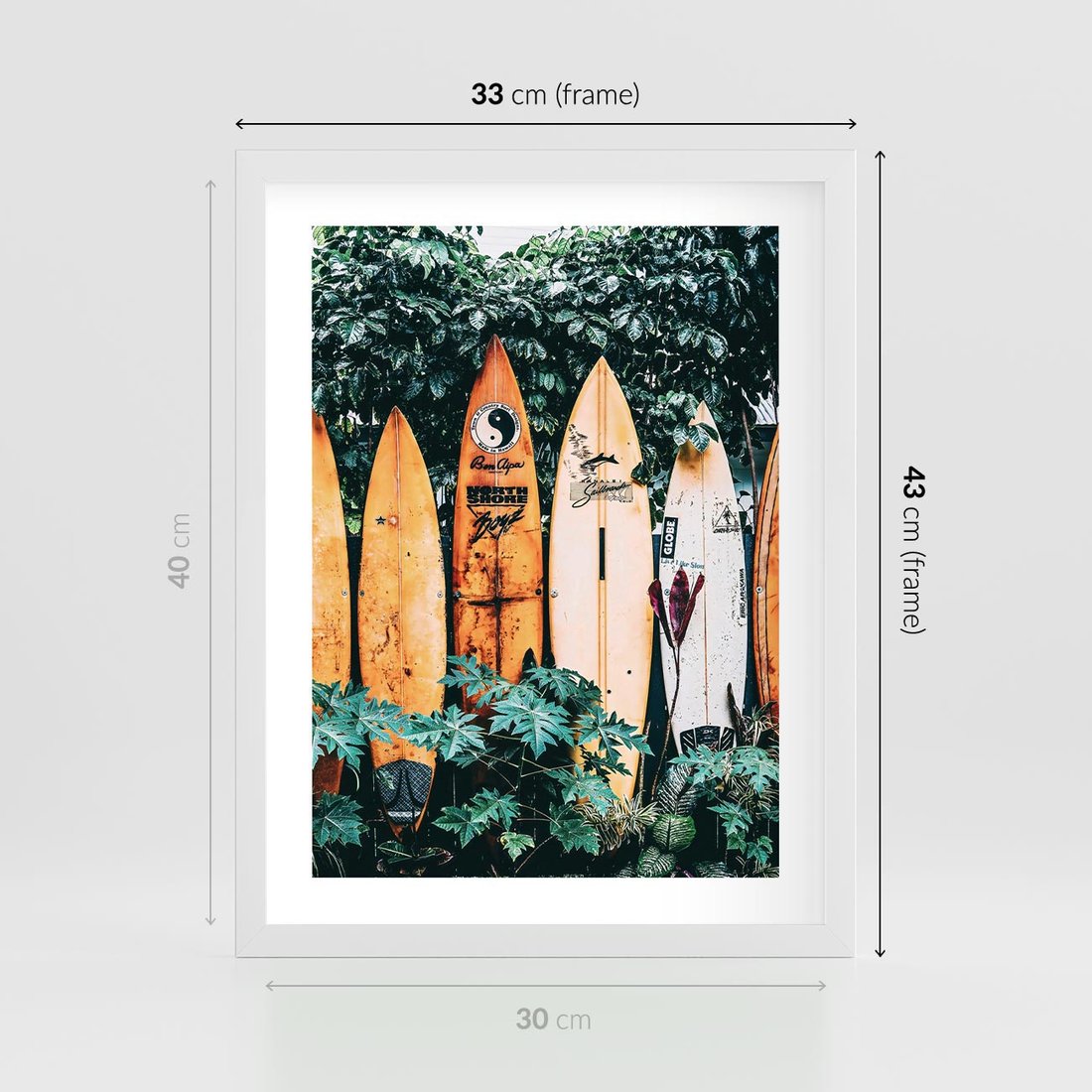Plakat w ramie 30x40 - Surfowanie w Harmonii z Naturą - deski surfingowe, oparte o rośliny - rama biała