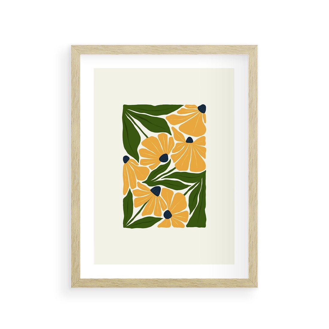 Ta nowoczesna grafika ukazuje żółte kwiaty w harmonijnej kompozycji z zielonymi liśćmi. "Świetliste Kwiaty Natury" to obraz pełen witalności i energii, który przyniesie do wnętrza promieniste odcienie natury. To wyjątkowy sposób na wprowadzenie radosnych akcentów kwiatowych i świeżości do przestrzeni w nowoczesnym stylu.