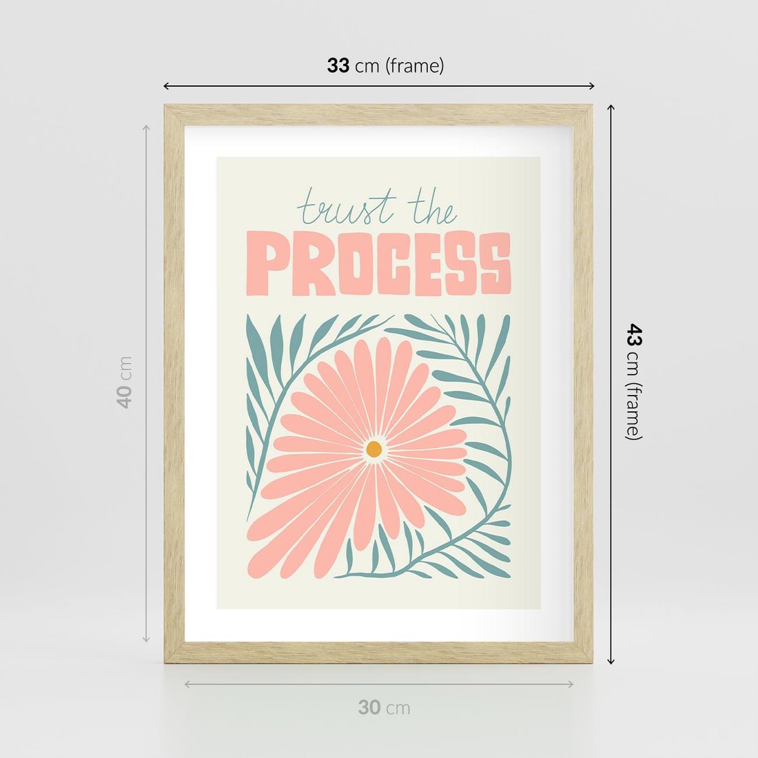 Plakat w ramie 30x40 - Symfonia Światła - typografia, pastelowa stokrotka - rama drewno