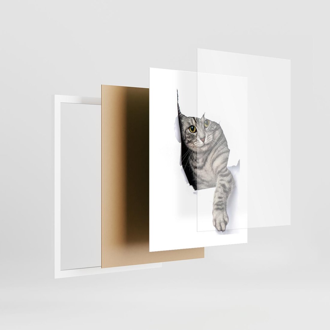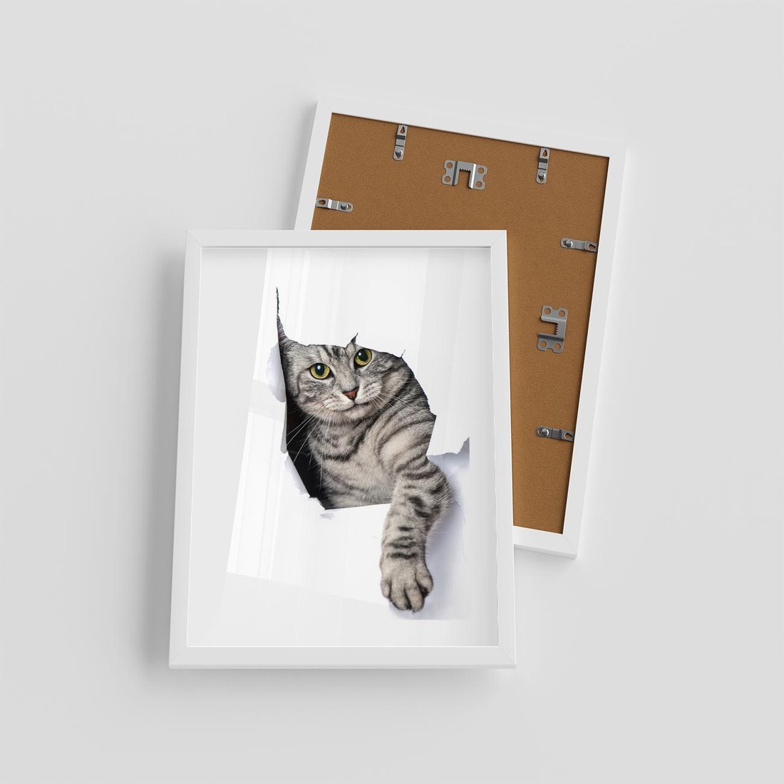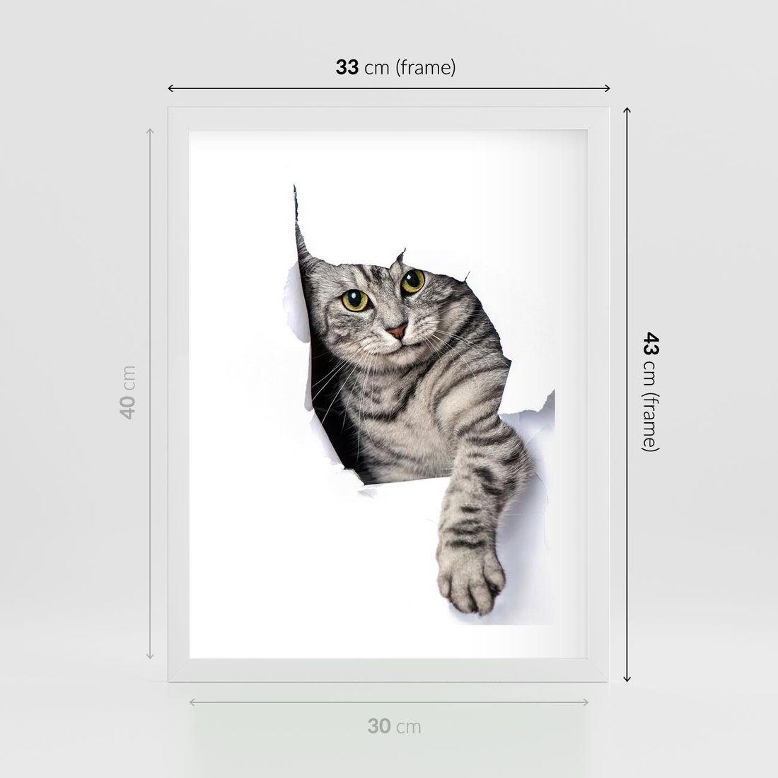 Plakat w ramie 30x40 - Tajemniczy kot i jego świat - kot, dziura - rama biała