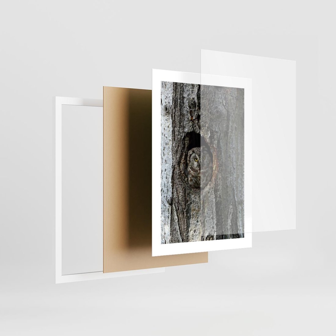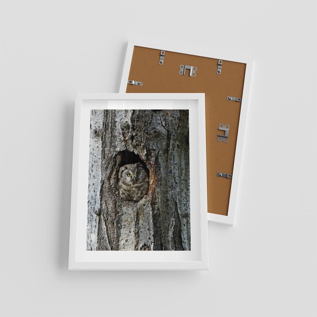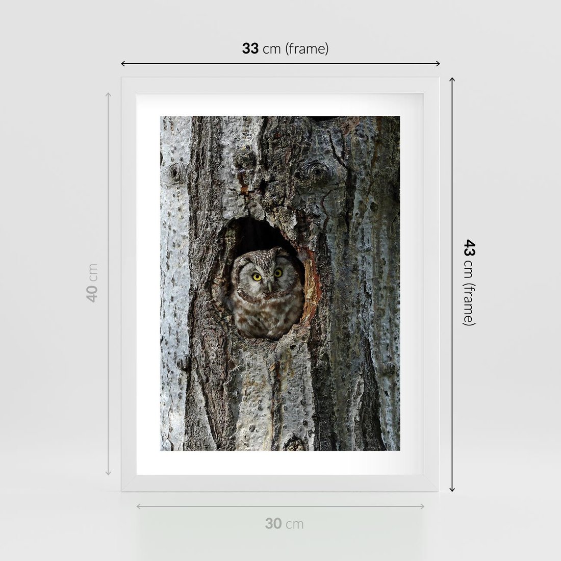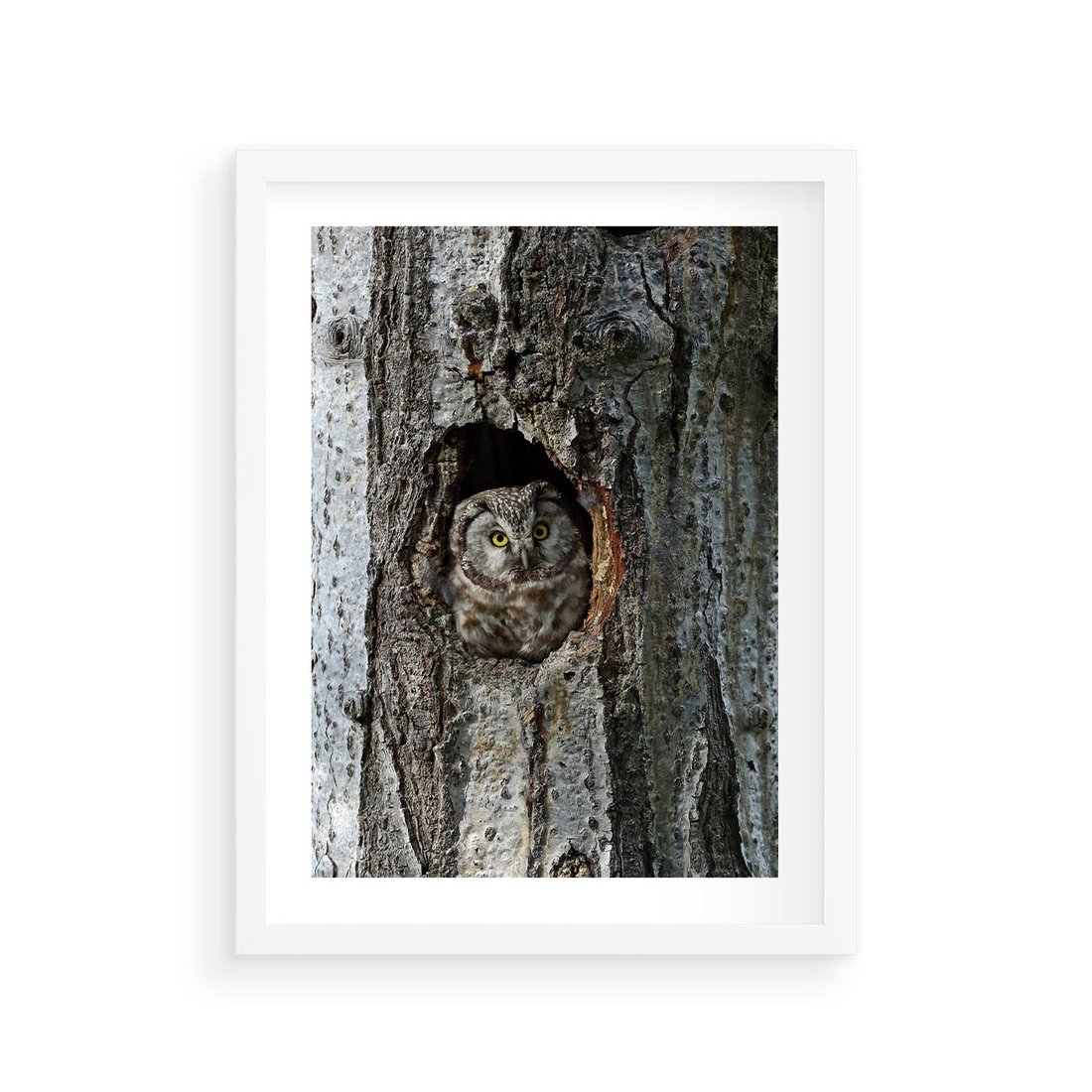 Plakat w ramie 30x40 - Tajemniczy W świecie Nocy - sowa, dziupla - rama biała