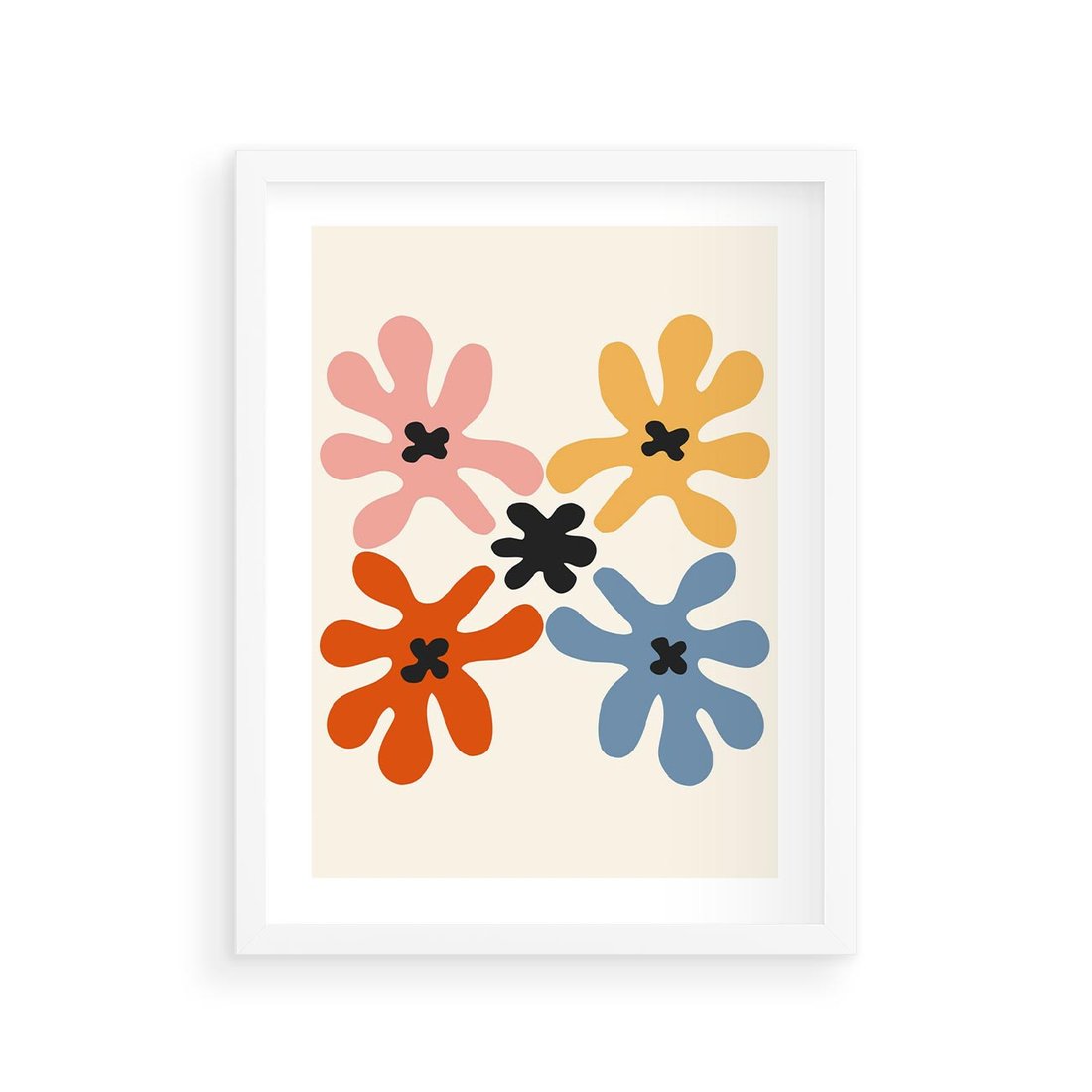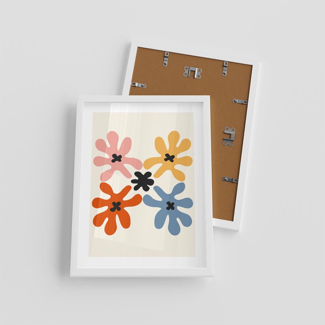 Ten minimalistyczny obraz przedstawia abstrakcyjne wielokolorowe kwiaty o dziwnych, intrygujących formach. Wykorzystując minimalizm, tworzy unikalny efekt wizualny, który ożywi i urozmaici każde wnętrze.