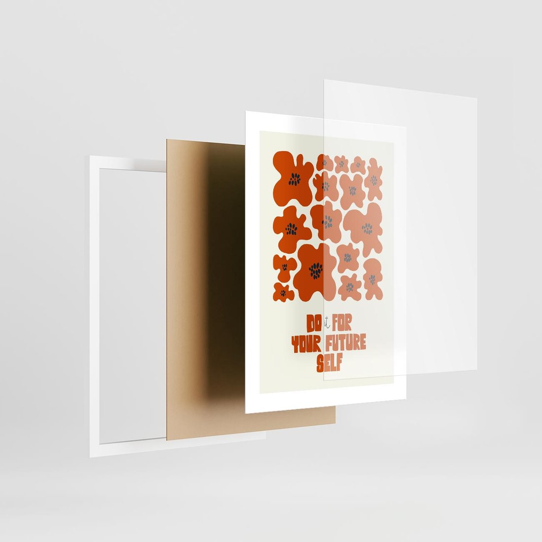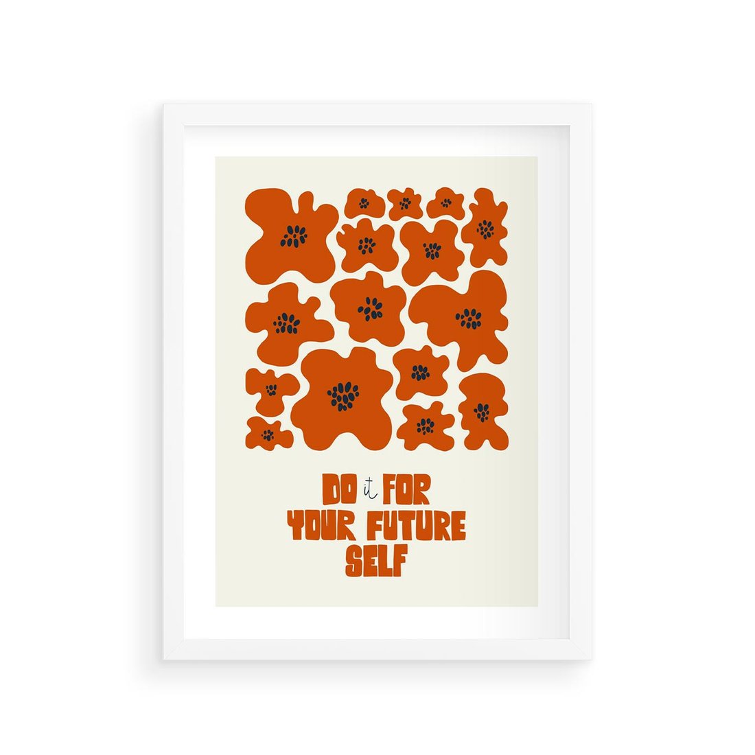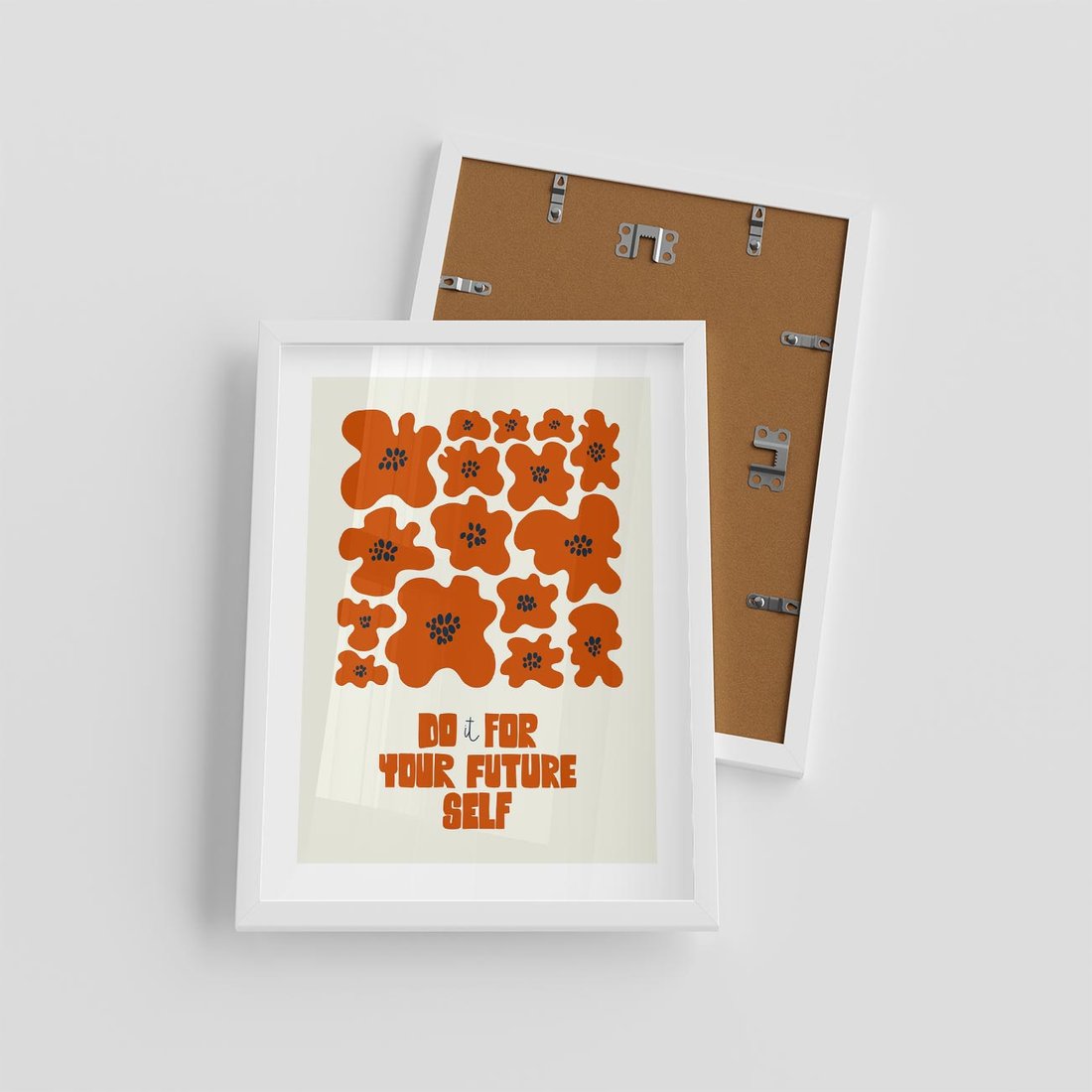 Ta nowoczesna grafika przedstawia kompozycję pomarańczowych kwiatów, która odzwierciedla ideę self-care. To obraz, który przypomina o ważności dbania o siebie, zachęcając do wewnętrznego odprężenia. Połączenie kwiatów z inspirującą typografią tworzy piękny przekaz, wprowadzając do wnętrza dawkę pozytywnej energii.
