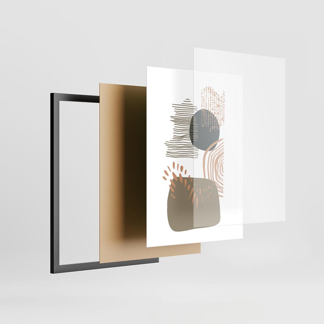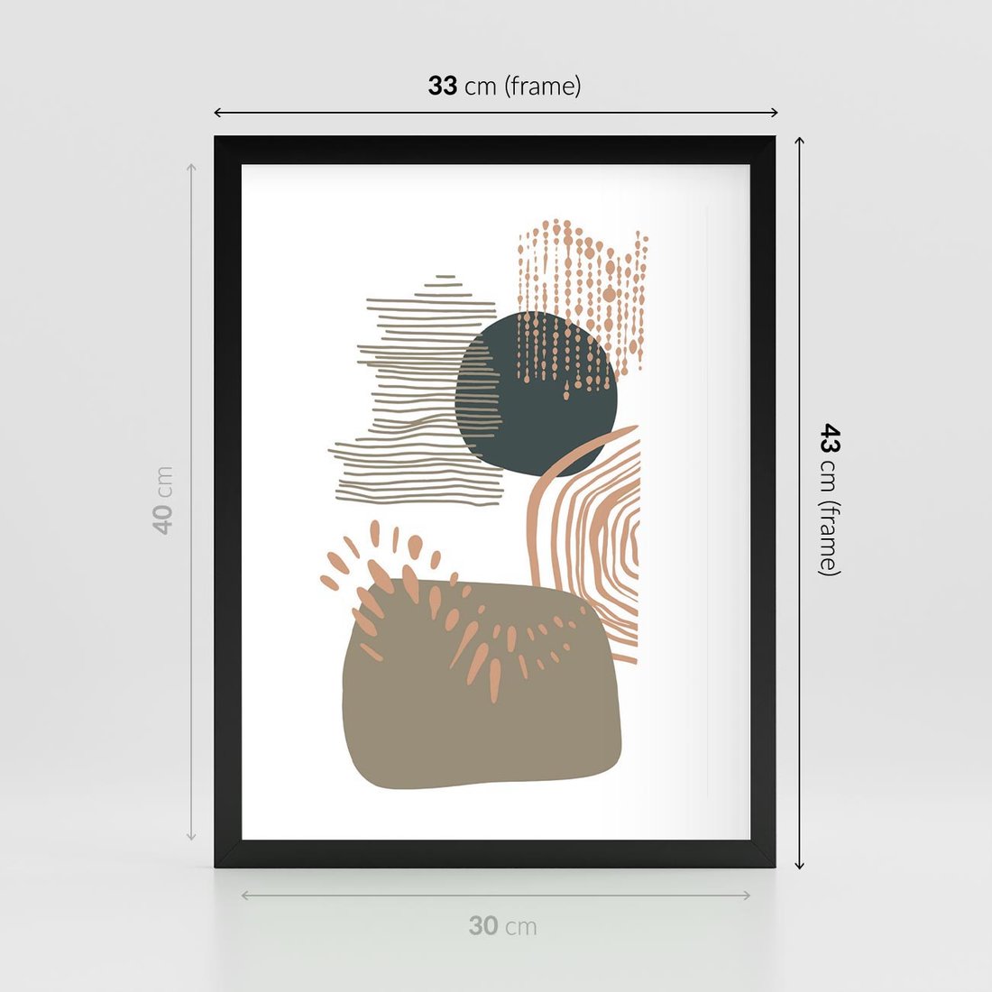 Plakat w ramie 30x40 - Taniec Plam - abstrakcyjna kompozycja z kropek kresek i kółek, odcienie brązu i beżu - rama czarna