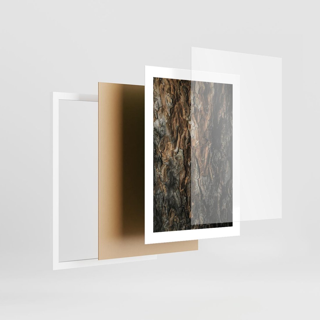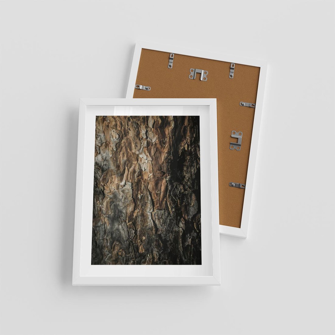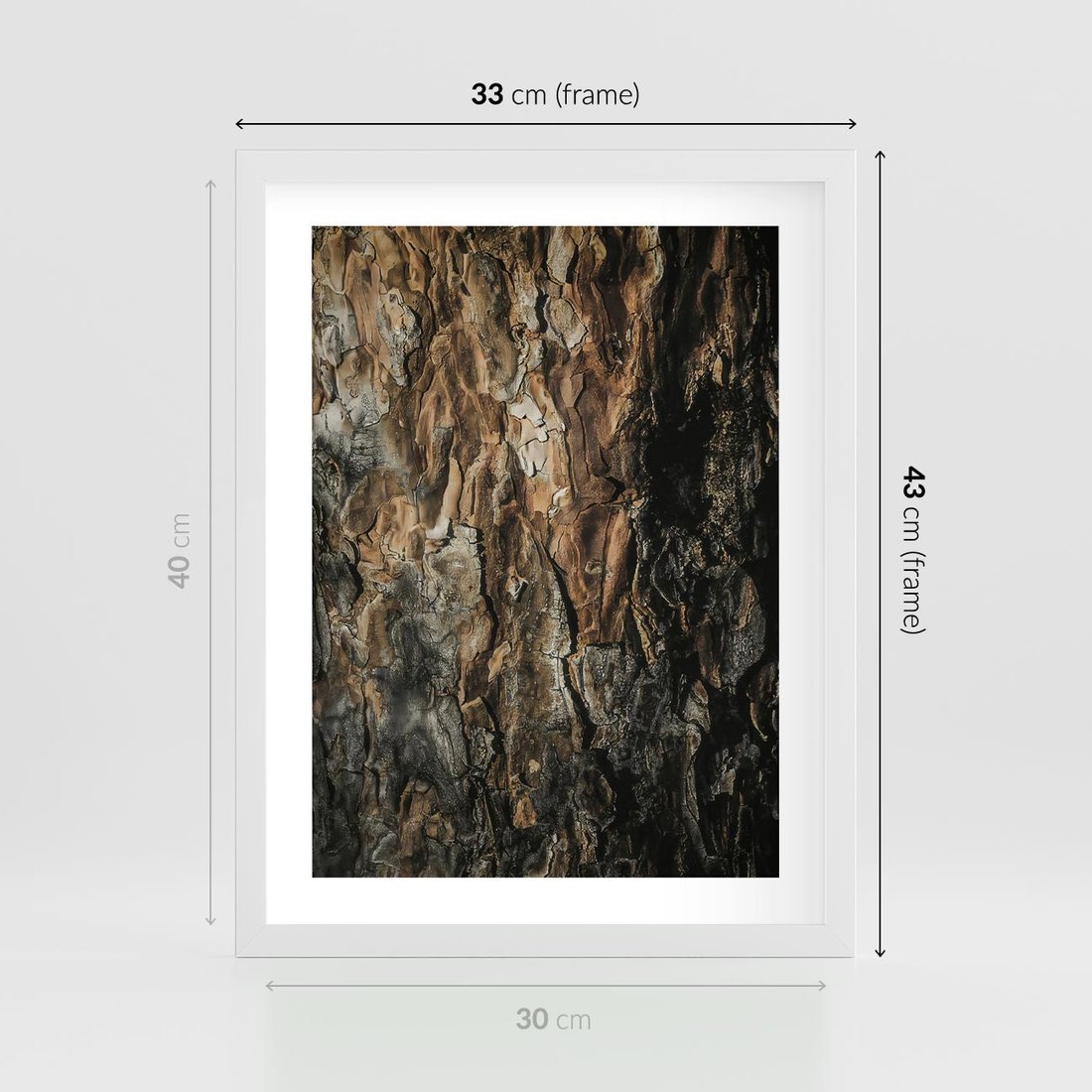 Plakat w ramie 30x40 - Tekstura Drewna: Zbliżenie - zbliżenie na pień drzewa, tekstura - rama biała