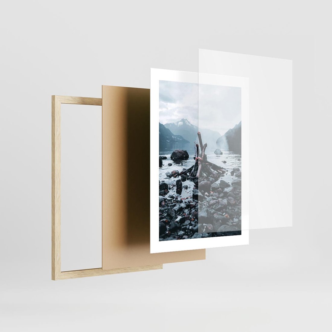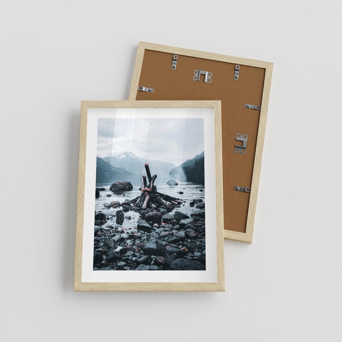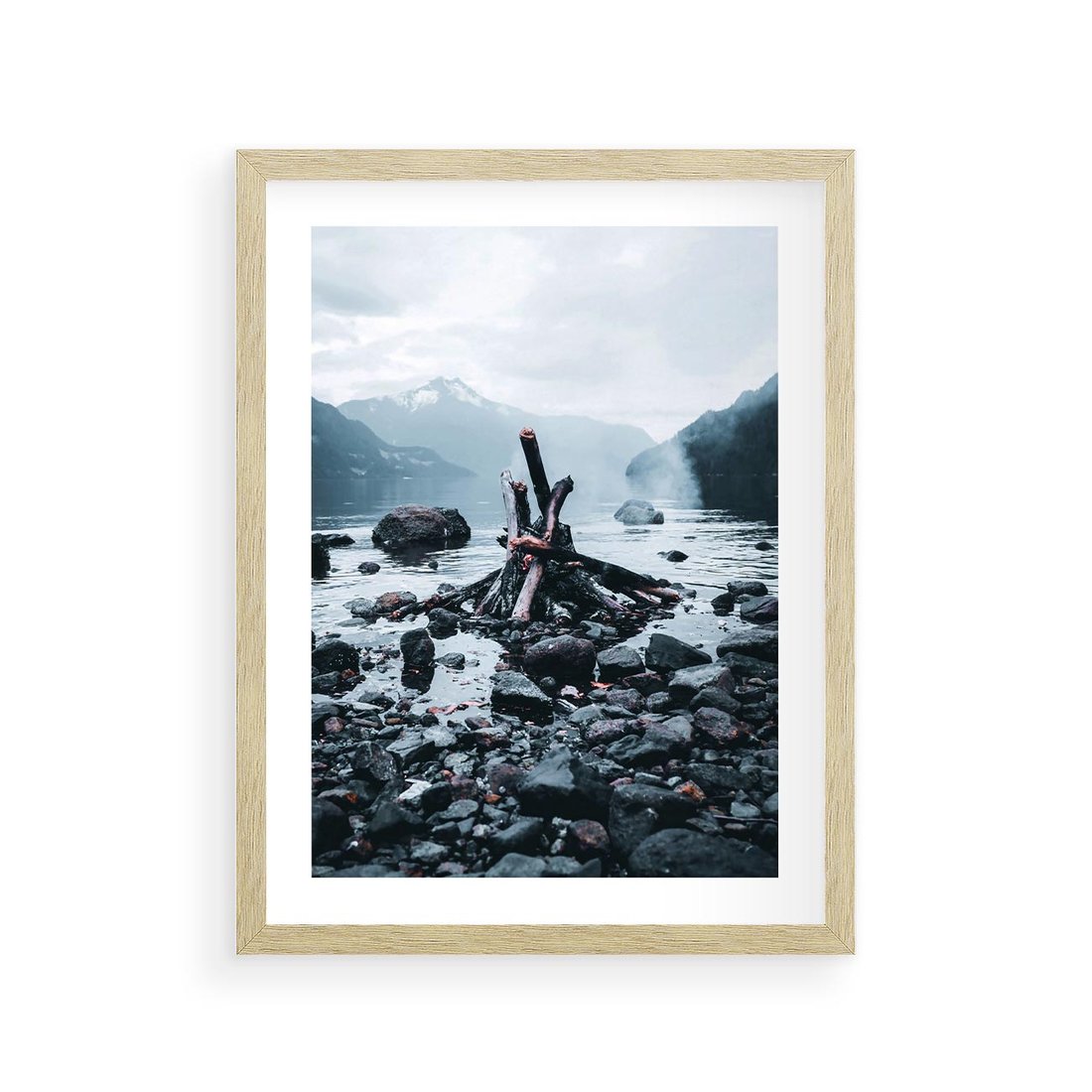 Plakat w ramie 30x40 - To ujęcie jeziora w górach z zgaszonym ogniskiem nad brzegiem, tworząc atmosferę spokoju i refleksji w otoczeniu przyrody. - jezioro w górach, zgaszone ognisko - rama drewno