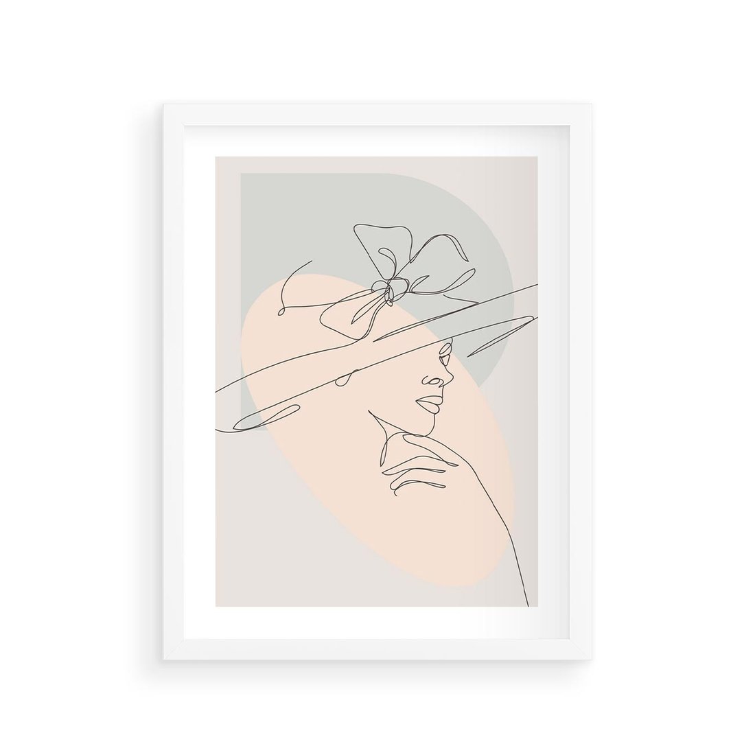 Obraz przedstawia minimalistyczną grafikę w pastelowych tonach, która jest szkicem twarzy kobiety narysowanym jedną linią. Ta kompozycja jest subtelna i wyrazista.