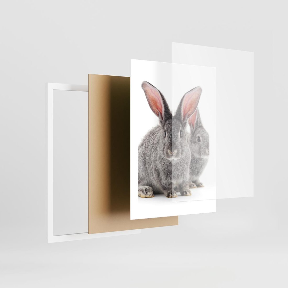 Odkryj urok królika w naturalnym otoczeniu dzięki temu uroczemu obrazowi. Z bujną roślinnością i czułym nastrojem, ożywia przestrzeń. Ta kompozycja dodaje czułości i harmonii, idealna dla miłośników zwierząt i przyrody.