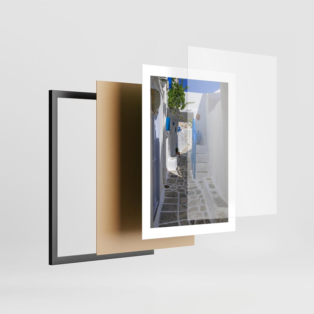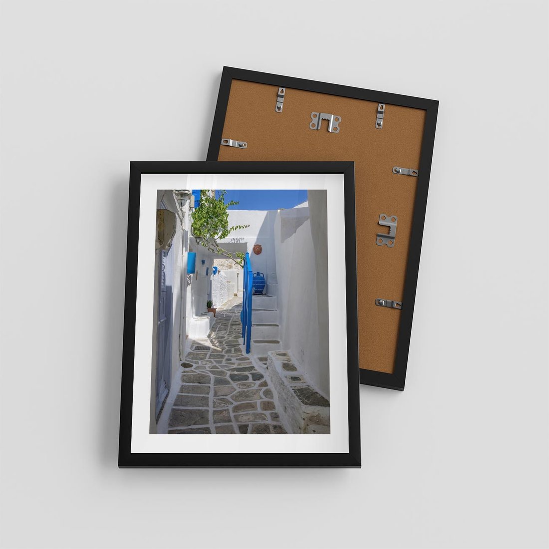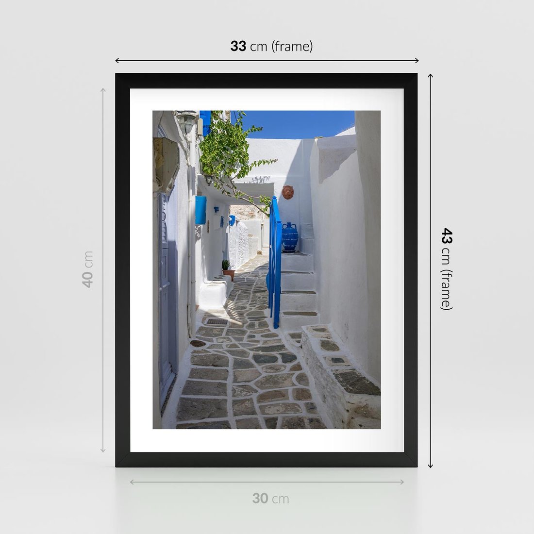 Plakat w ramie 30x40 - Uroki Santorini: Perspektywiczna Uliczka - uliczka, perspektywa - rama czarna