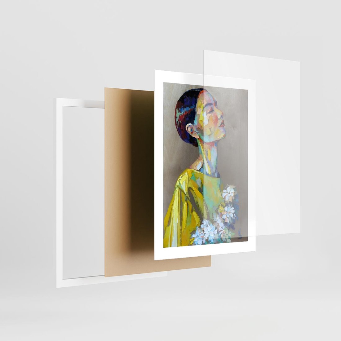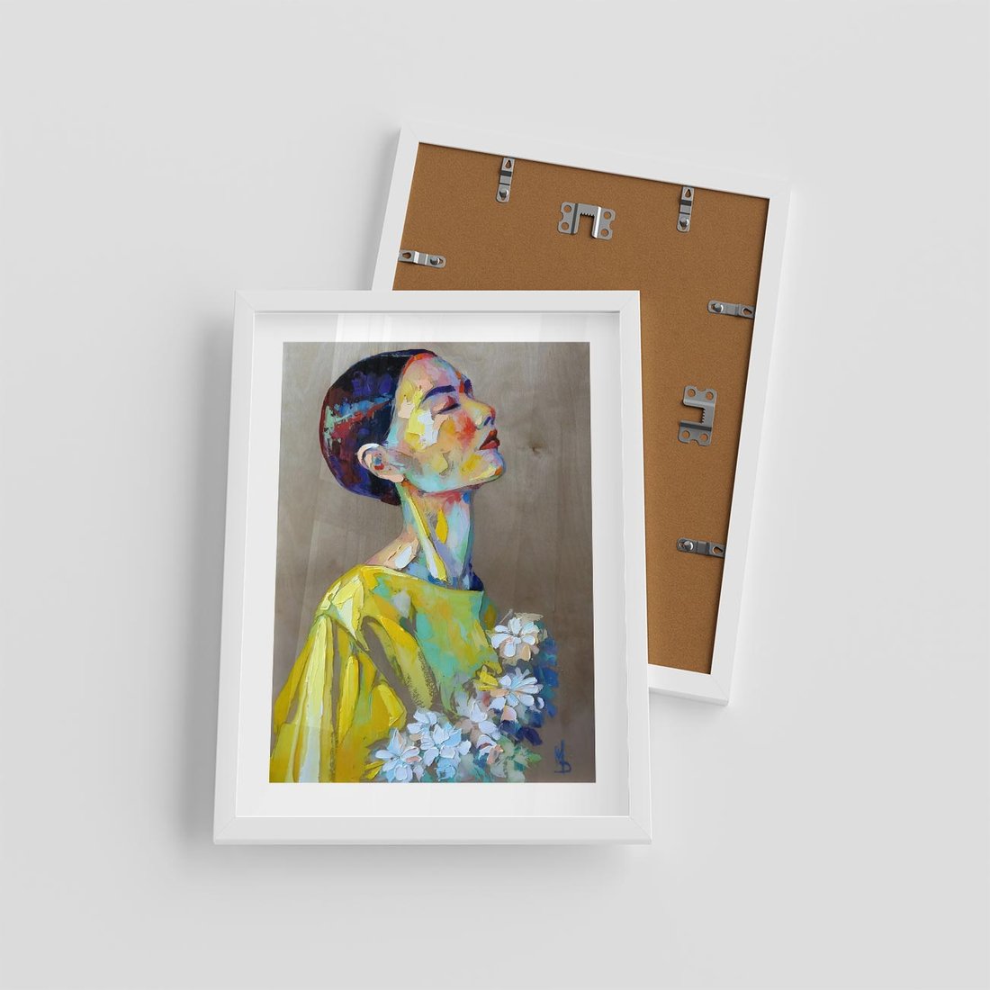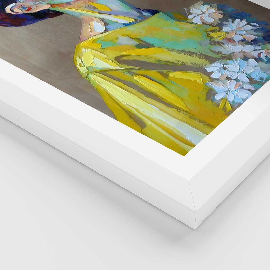 Plakat w ramie 30x40 - W Żółtej Sukience - olejny abstrakcyjny obraz, portret kobiety w żółtej sukience - rama biała