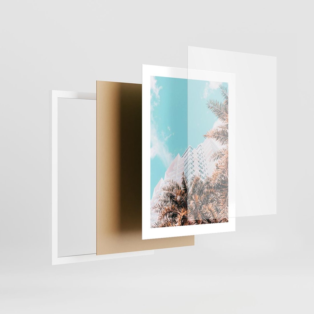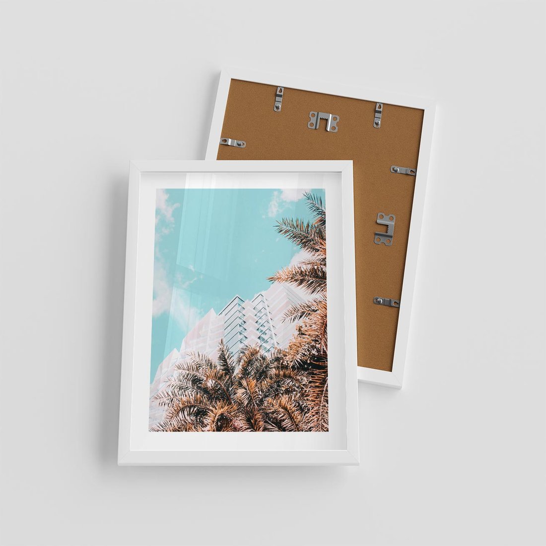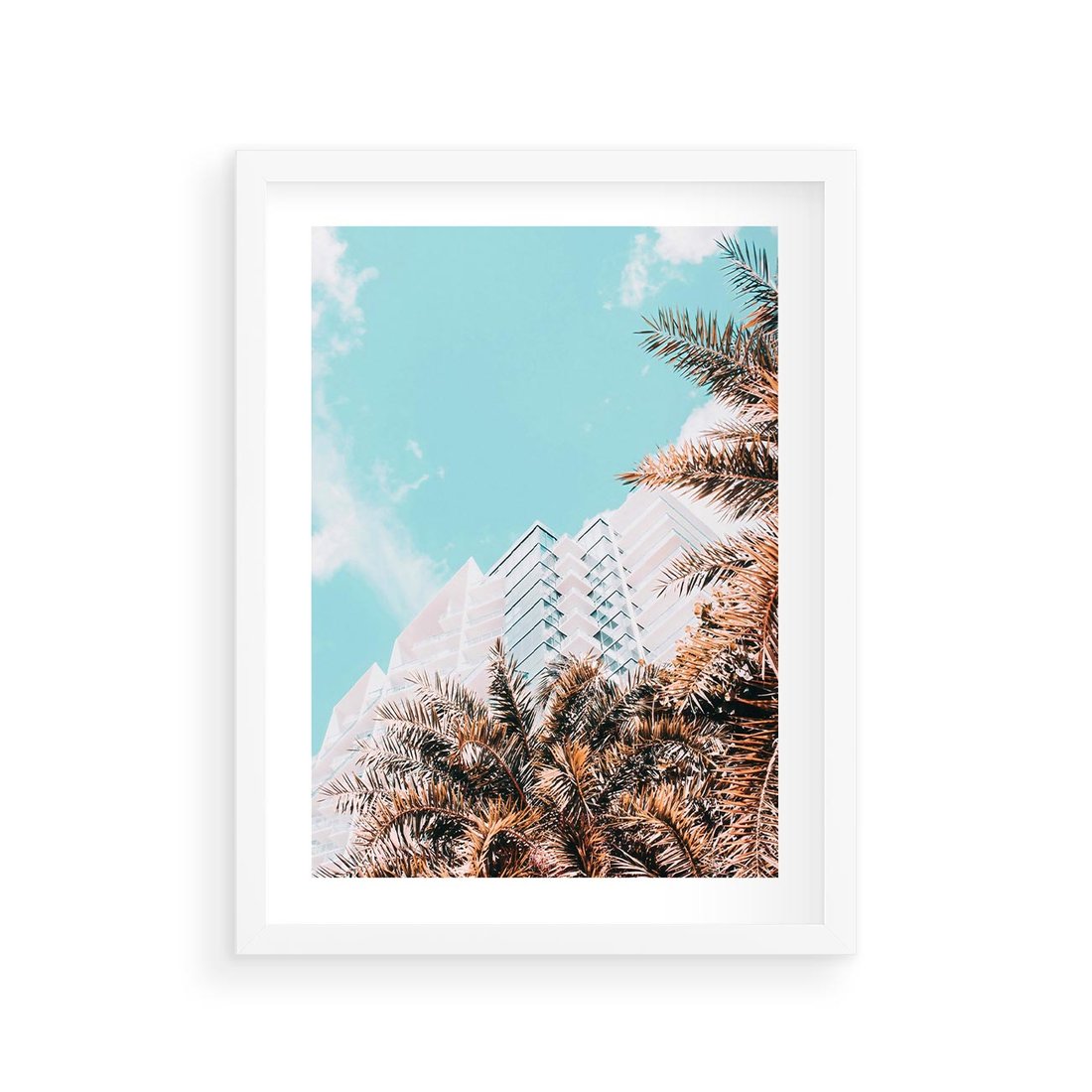 Plakat w ramie 30x40 - Wakacyjny Raj - palmy, wysokie budynki - rama biała