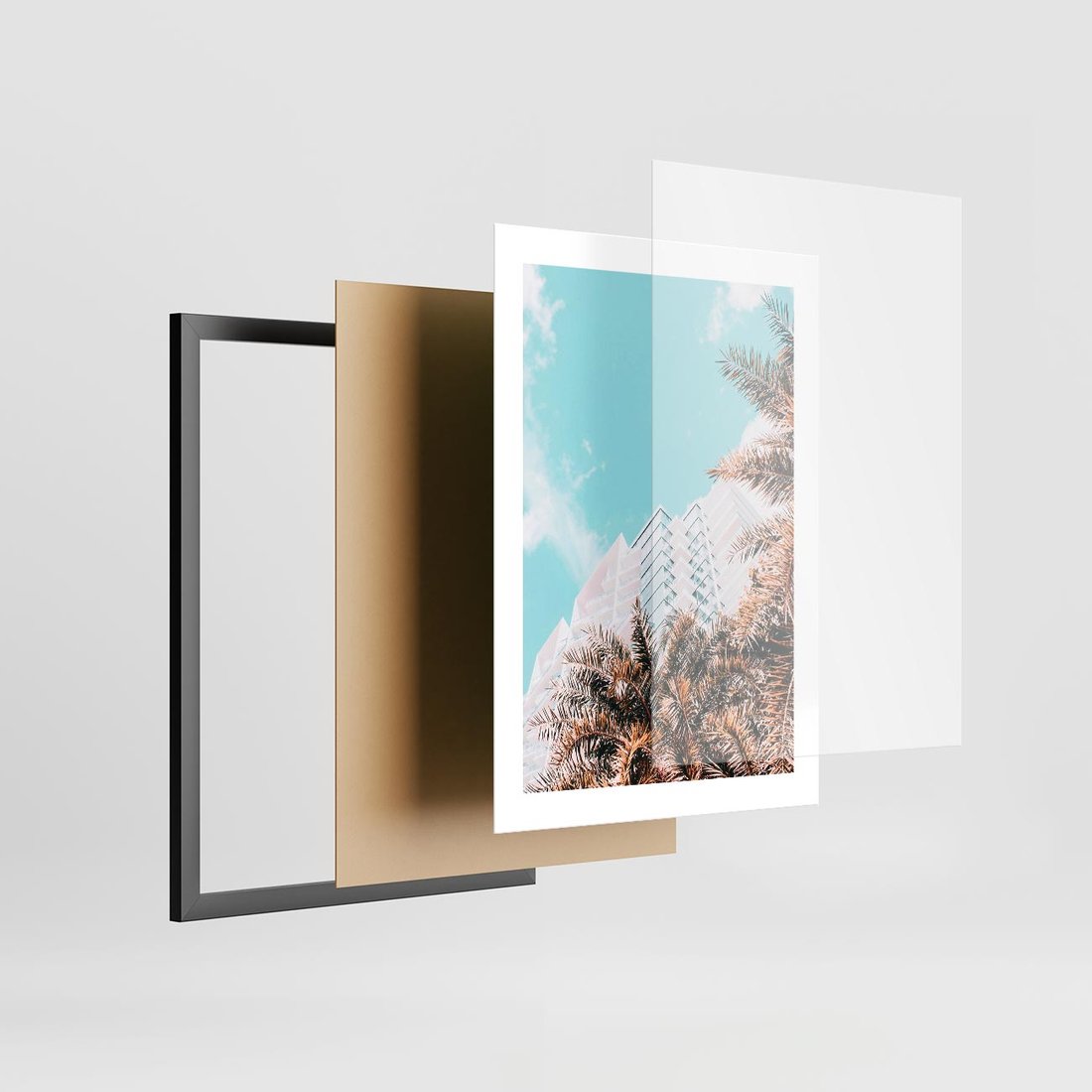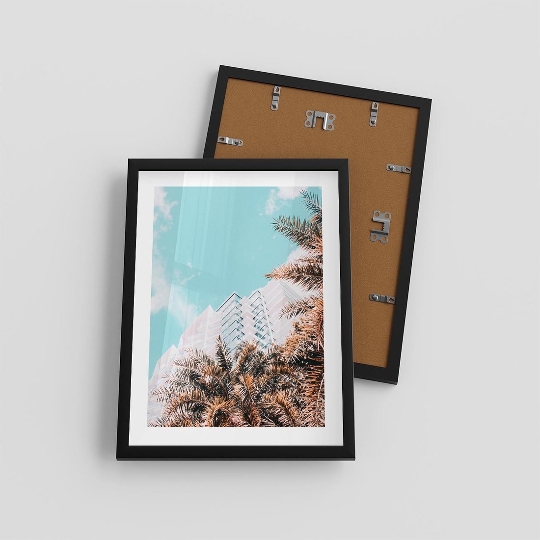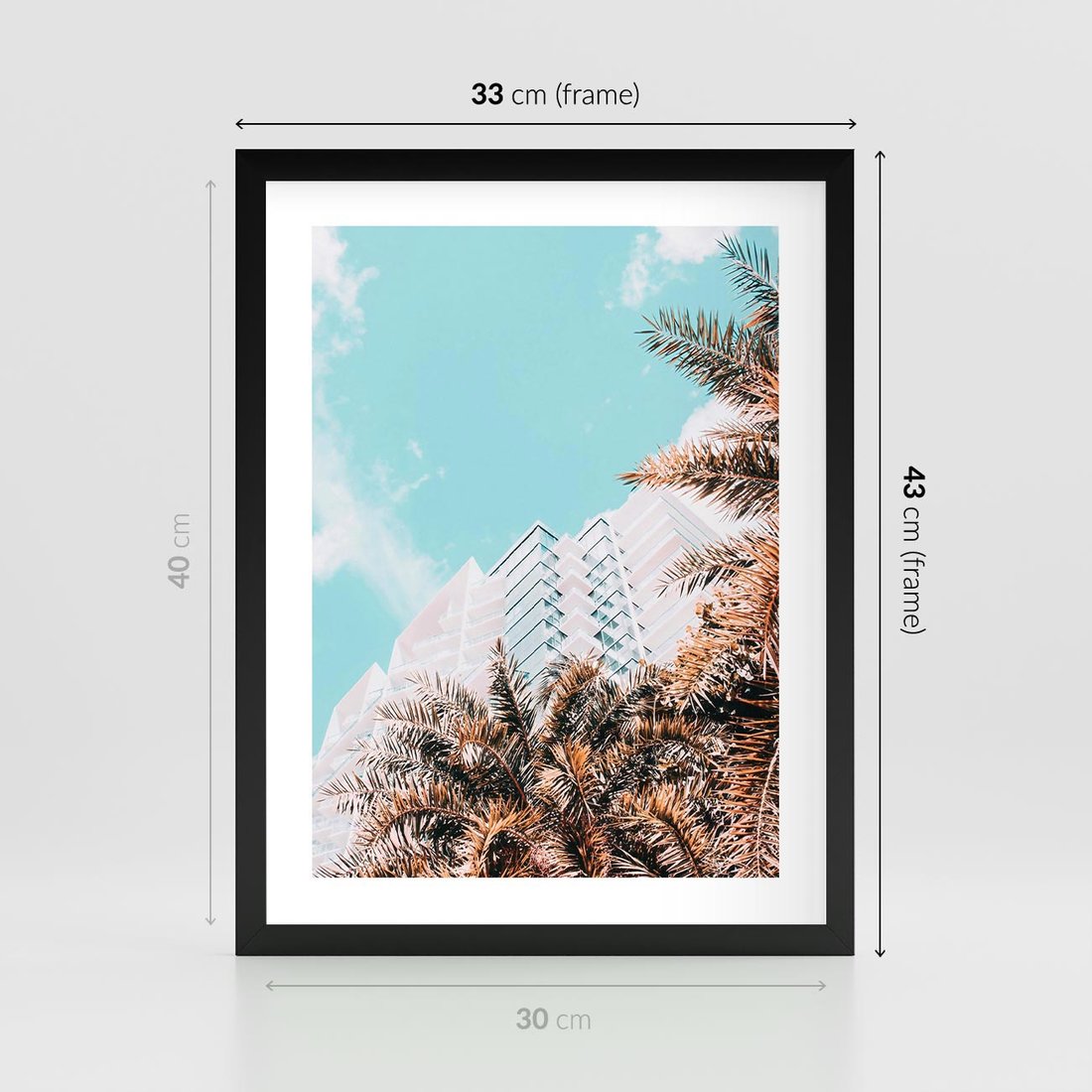 Plakat w ramie 30x40 - Wakacyjny Raj - palmy, wysokie budynki - rama czarna
