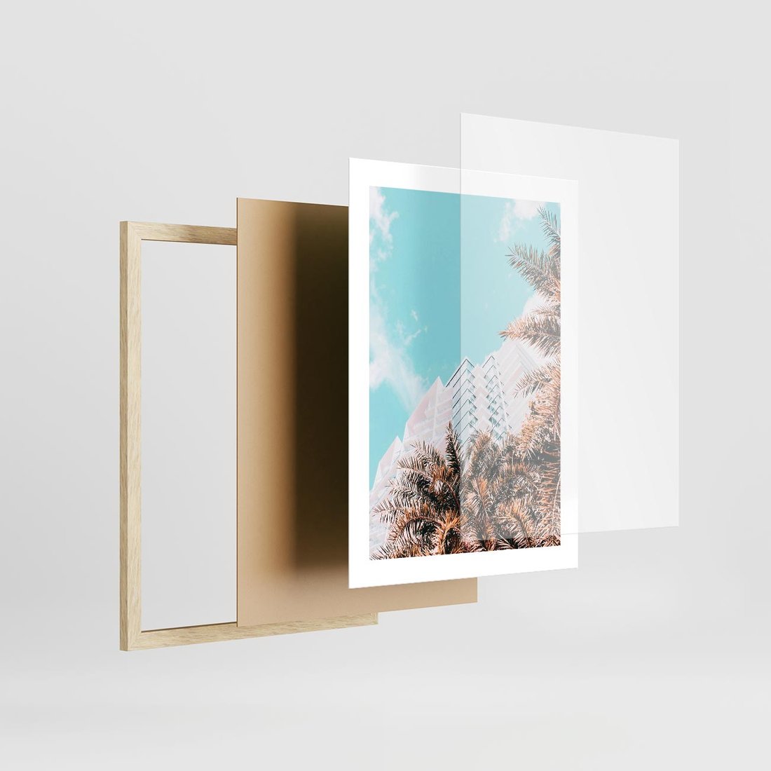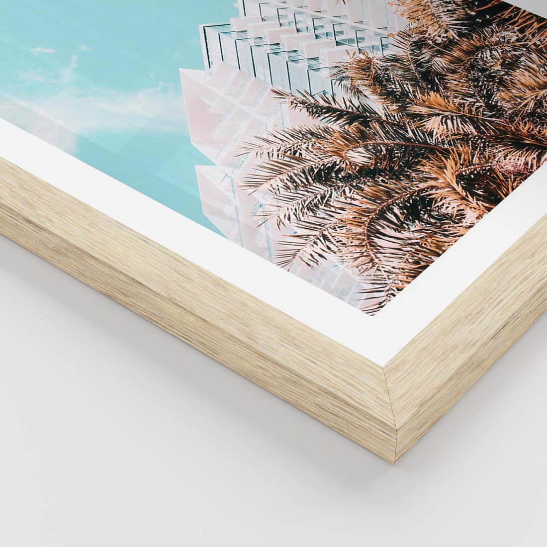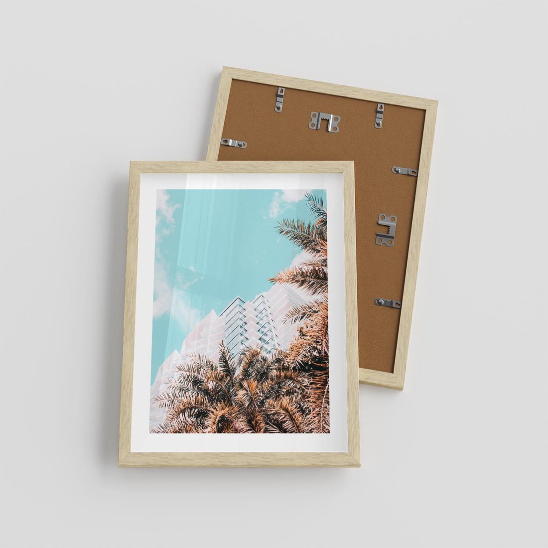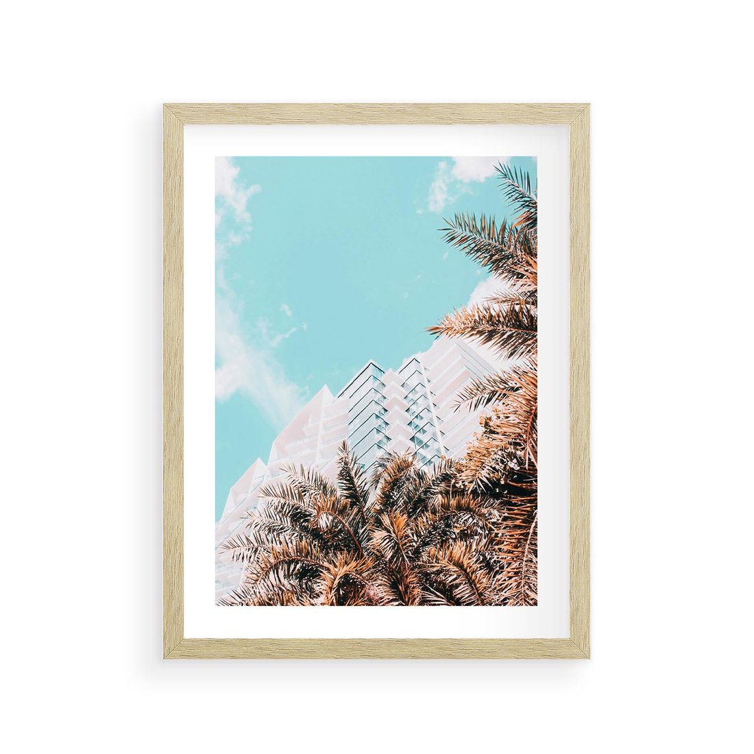 Plakat w ramie 30x40 - Wakacyjny Raj - palmy, wysokie budynki - rama drewno