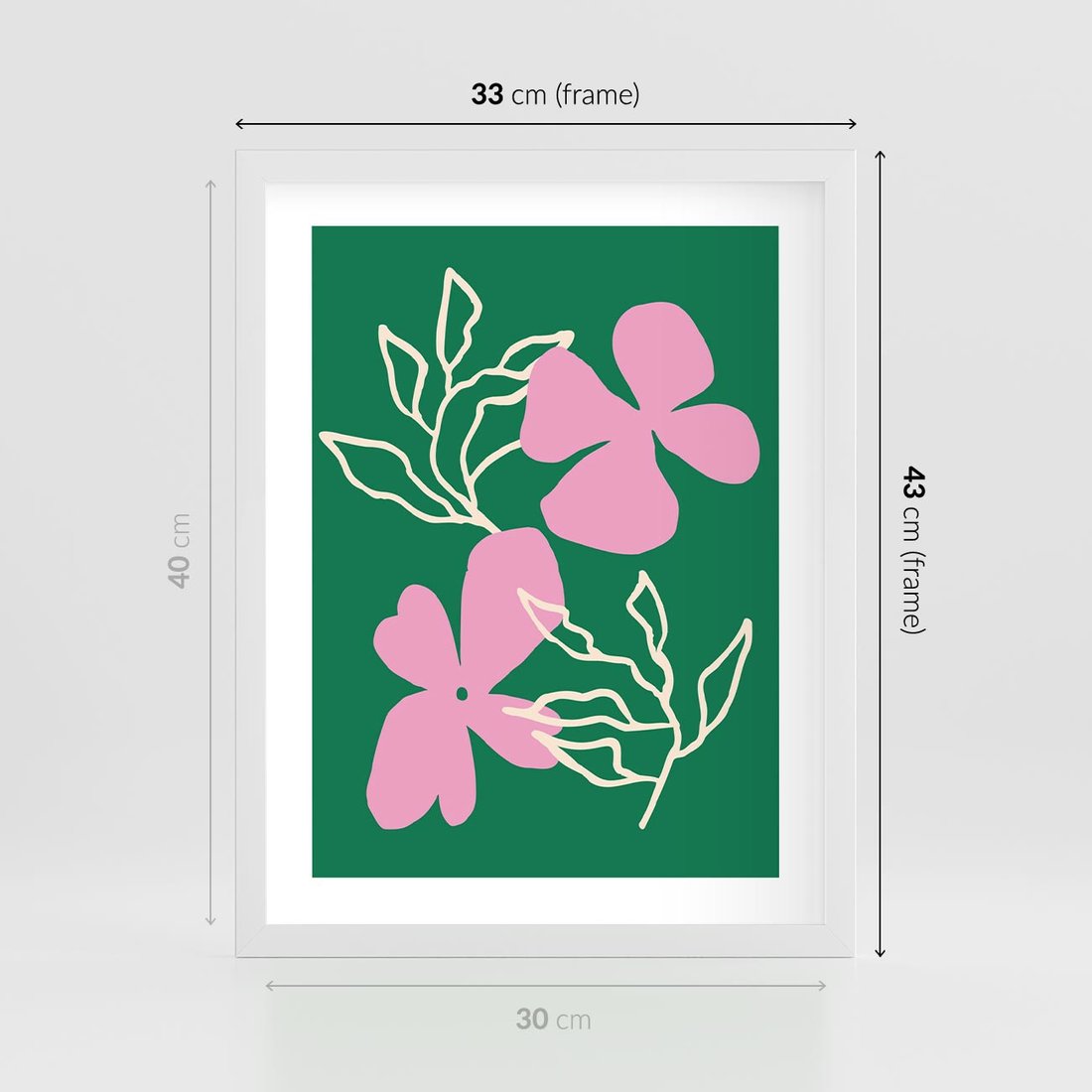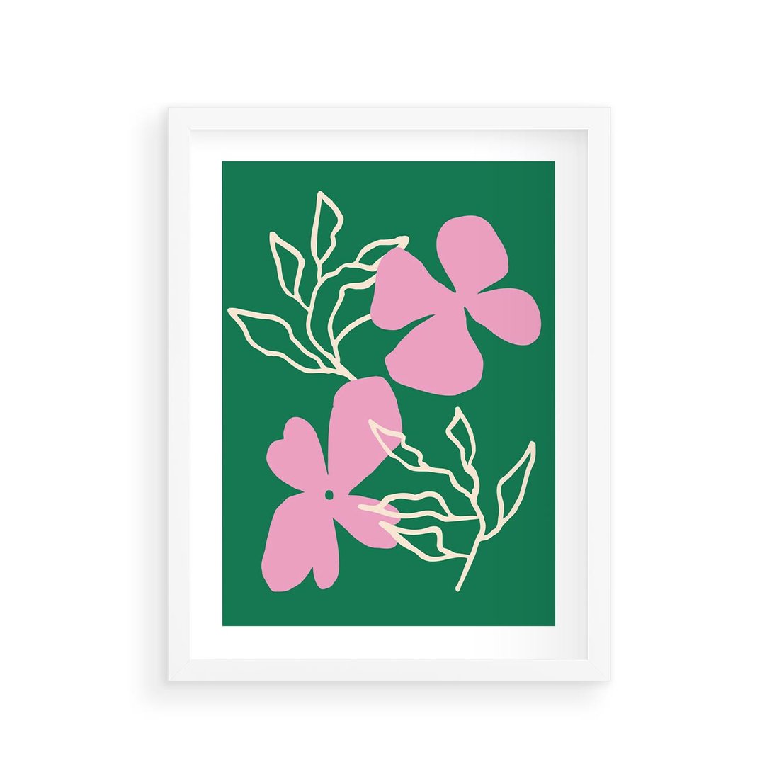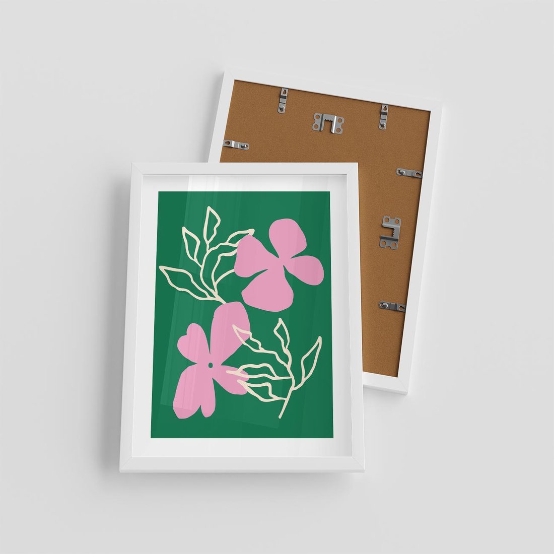 Ten abstrakcyjny plakat w boho stylu ukazuje intensywną zieleń i róż, z delikatnie wkomponowanymi kwiatowymi motywami. Idealnie pasuje do biura, dodając odrobinę natury i artystycznej energii, tworząc inspirujące otoczenie do pracy i twórczego myślenia.