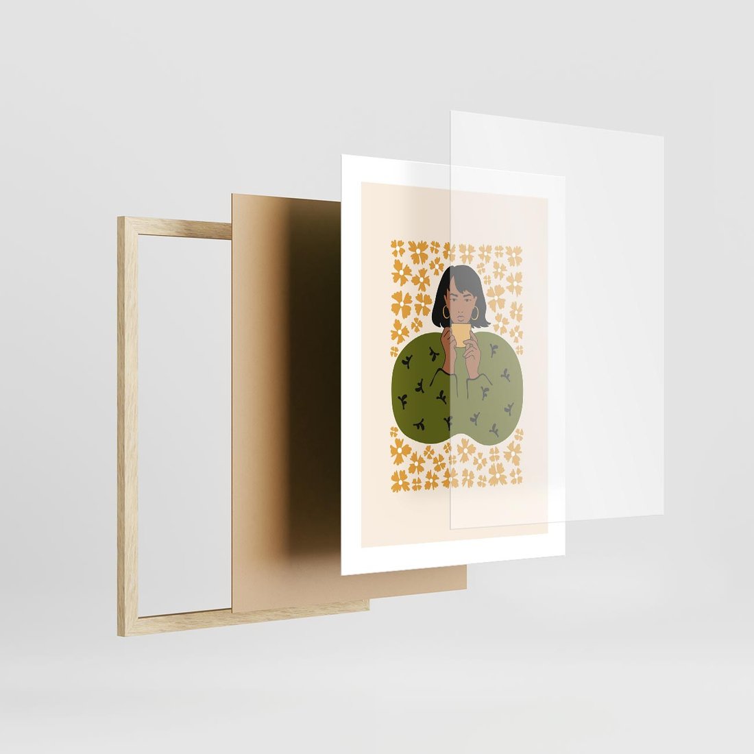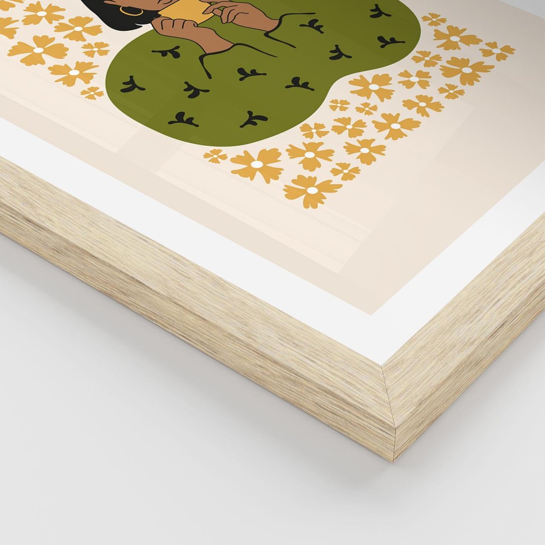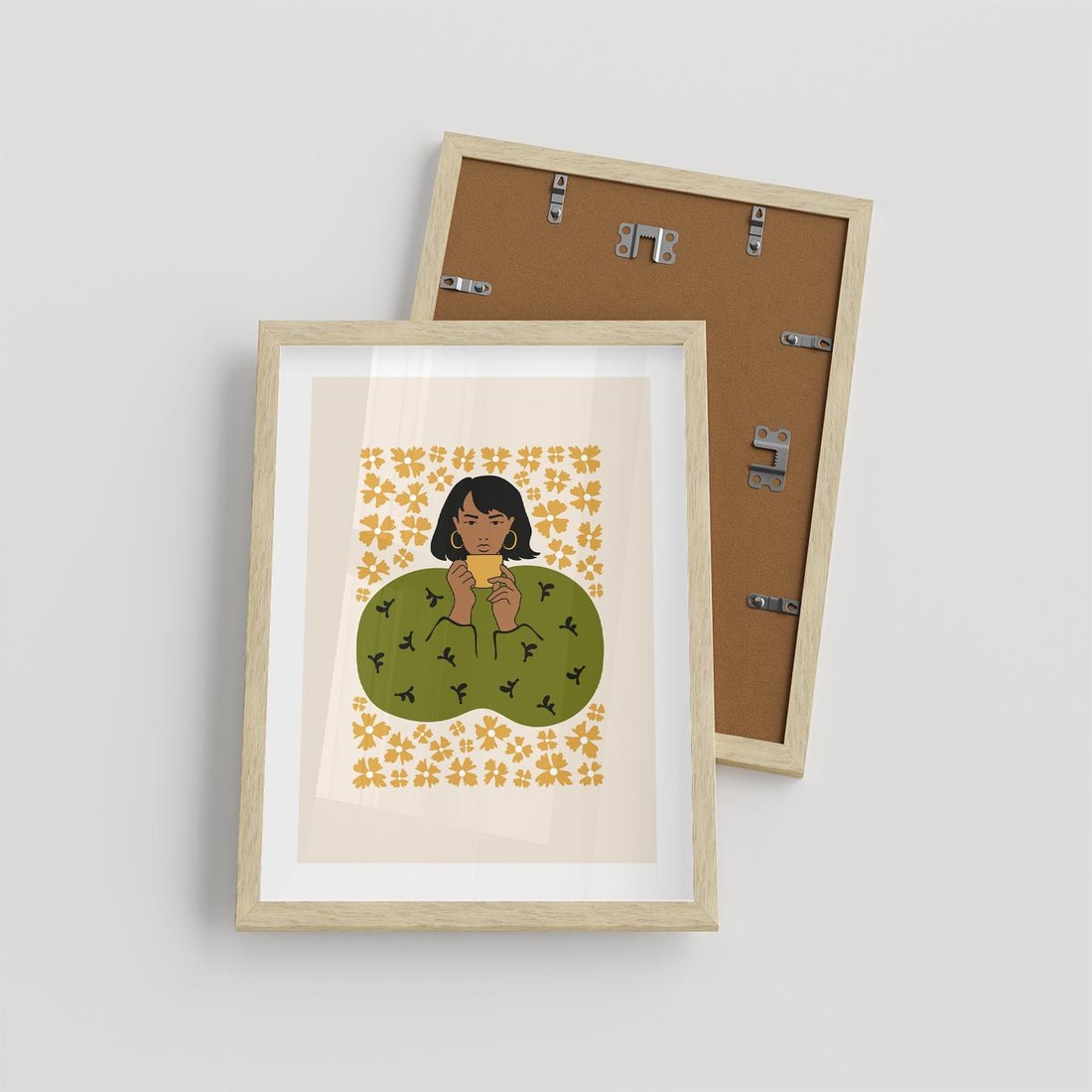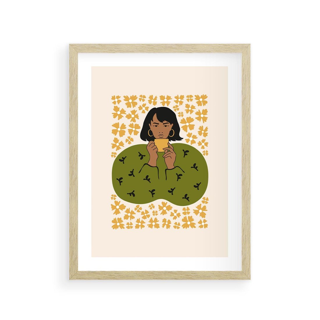 Ten nowoczesny plakat przedstawia minimalistyczną kompozycję kobiety otoczonej delikatnymi kwiatami. Sztuka ta łączy wyrazistość i prostotę, tworząc spokojny i inspirujący obraz, który zaprasza do refleksji i cieszenia się pięknem natury w harmonii z nowoczesnym stylem.