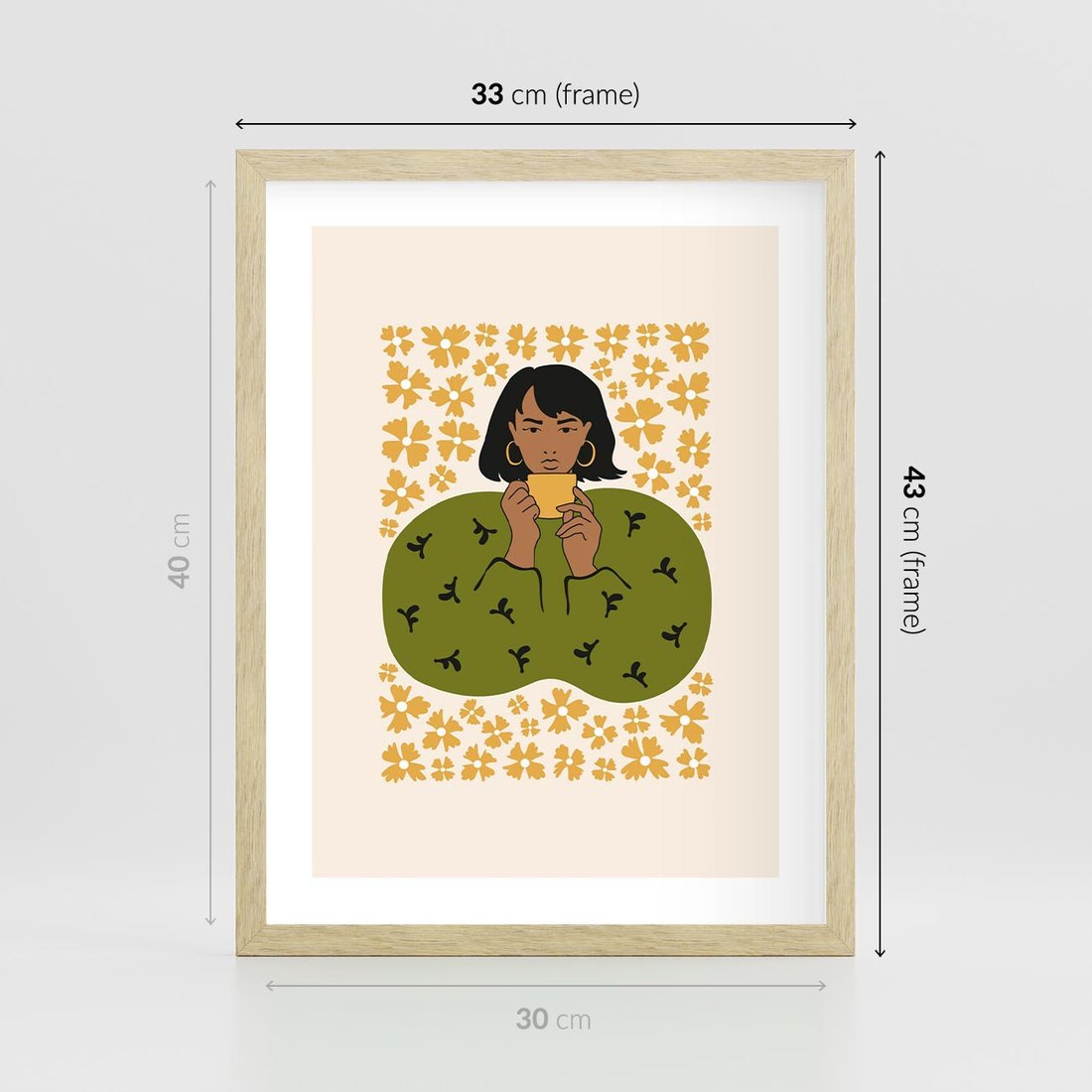 Plakat w ramie 30x40 - Wewnętrzne Fale - nowoczesny plakat, kobieta otoczona liśćmi - rama drewno