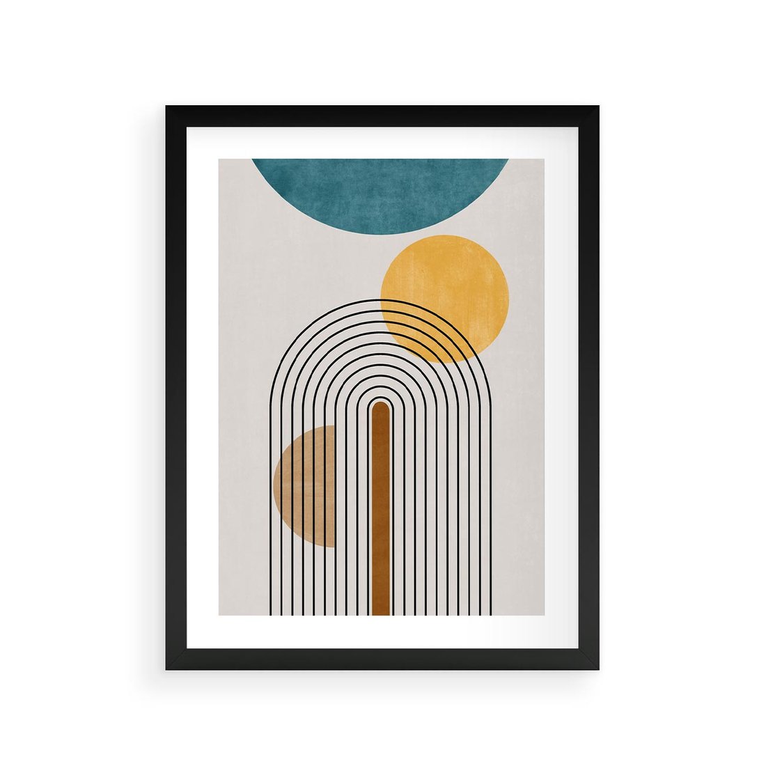 Ten plakat w stylu mid century łączy nowoczesną sztukę z regularnymi liniami i okręgami, tworząc harmonijną kompozycję, która idealnie pasuje do współczesnych wnętrz.