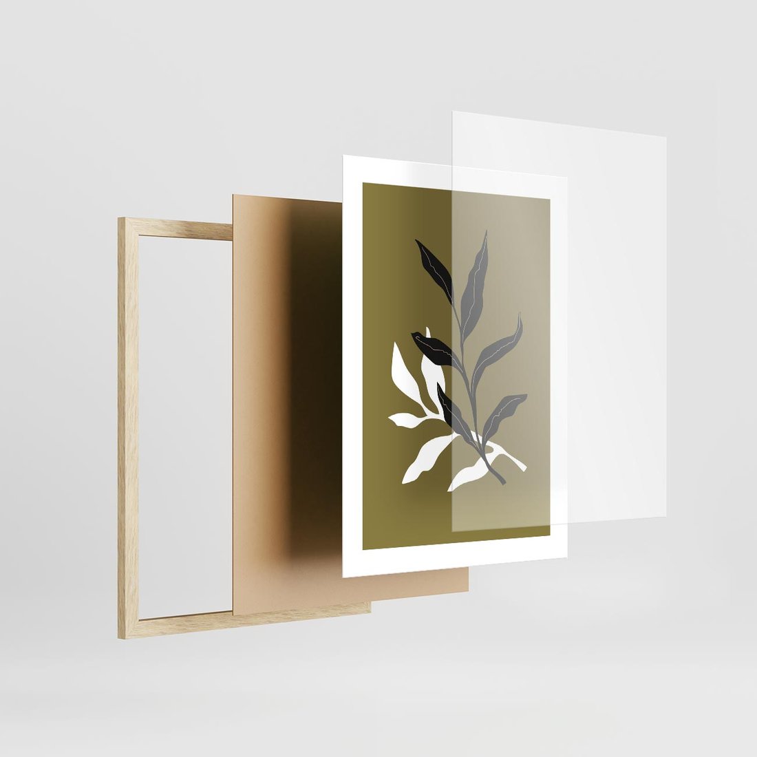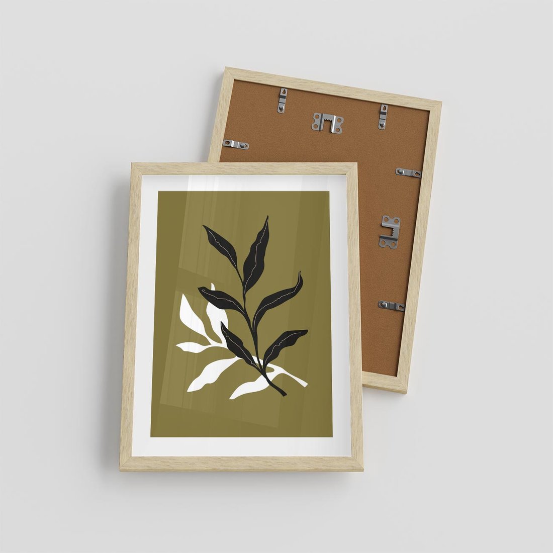 Ten plakat ukazuje liście i gałązki w minimalistycznym stylu na oliwkowym tle, w kontrastujących odcieniach bieli i czerni. Sztuka ta oddaje spokój i równowagę natury, tworząc jednocześnie elegancki i wyrafinowany element dekoracyjny, który wnosi harmonię i naturalny urok do Twojej przestrzeni.